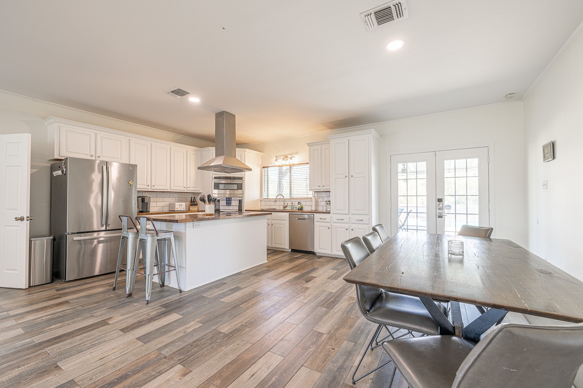 Relájate en una nueva casa adosada «Mid Century Modern» ubicada en el centro histórico de Bryan y a poca distancia a pie de Ronin, Black Water Draw, RX Pizza, The Village, Cilantro y muchos más restaurantes. El dormitorio principal tiene una cama tamaño king y cada habitación tiene un televisor inteligente de 58 pulgadas. Inicia sesión en tu cuenta personal de streaming o utiliza nuestro Hulu, Disney o ESPN, como cortesía. Relájate en el patio trasero privado con una hermosa vista o cocina en la hermosa cocina que incluye una cafetera Keurig con cápsulas y cremas.