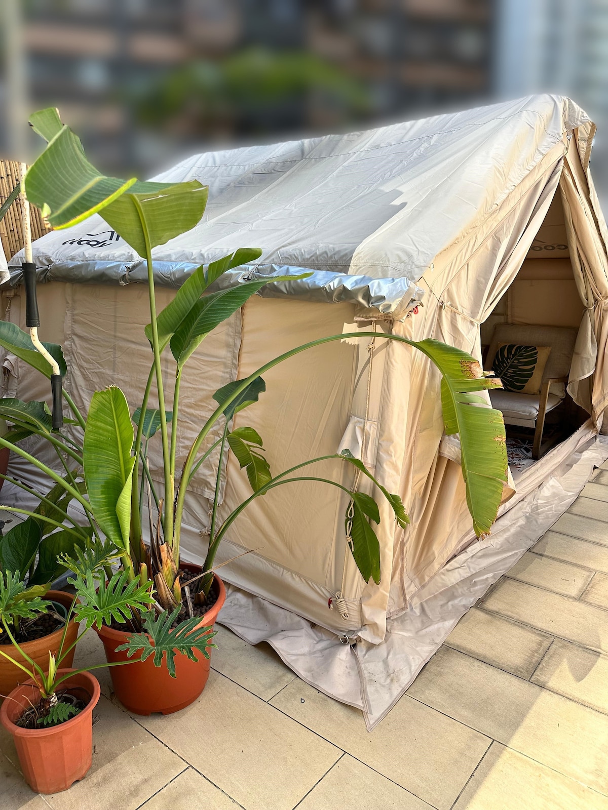 ¡Escápate de lo común en el corazón de Hong Kong! Ubicado entre edificios altos, pero encaramado en lo alto de un encantador edificio bajo, este alojamiento único ofrece un oasis tranquilo y lleno de plantas con vistas al horizonte. Encontrarás una tienda de campaña glamping de 10 m² con una cama tamaño queen, un calentador, WC/ducha, lavabo, mininevera y mesa de comedor para 6; ¡ideal para bebidas al atardecer! La azotea es toda tuya. Estamos ubicados en una calle tranquila y empinada en Mid-Levels, tendrás que caminar cuesta arriba y subir 4 tramos de escaleras, ¡así que no lleves mucho equipaje!