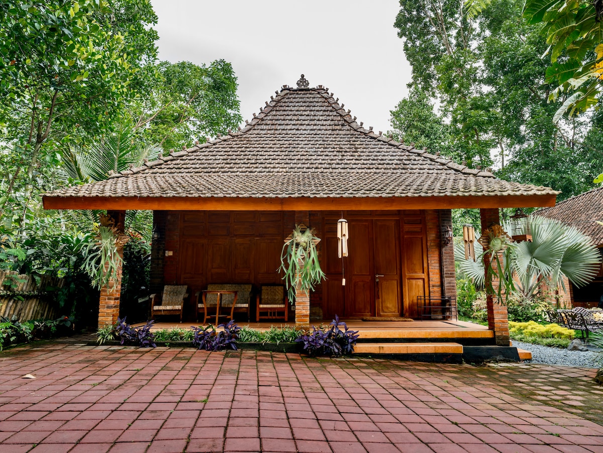 Experimenta el encanto de la vida tradicional en el Joglo Retreat de la casa de madera tradicional javanesa, exclusivamente tuyo para reuniones familiares memorables. Nuestra casa Joglo tiene capacidad para 6-7 adultos en tres habitaciones, situada en un tranquilo telón de fondo del pueblo. Desde el despertar hasta los suaves sonidos del pueblo y explorar los exuberantes jardines, la propiedad garantiza una escapada familiar inolvidable. Las comodidades modernas como duchas cálidas, WiFi y cocina totalmente equipada se mezclan a la perfección con este entorno tradicional.