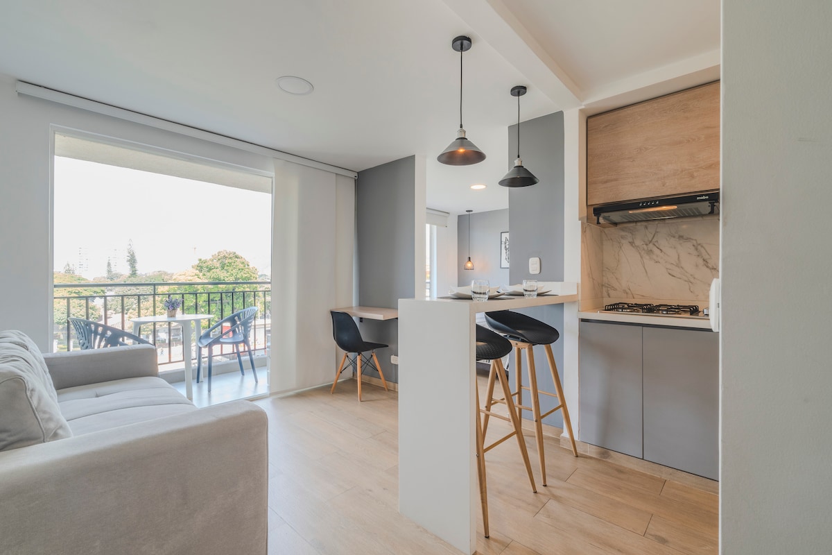 Perú Boutique: Moderno Apartamento en el Exclusivo sector del Norte de Cali en el barrio Santa Mónica. Este tranquilo, cómodo, bien dotado e iluminado espacio se encuentra a tan solo unos minutos de la vibrante Zona Rosa de Granada. Es el lugar ideal para viajes de negocio o turismo, ya que cuenta con excelente conexión Wi-Fi. Ubicación inmejorable: A pocos pasos encontrarás gimnasios, restaurantes, fácil acceso a transporte público, supermercados y centros comerciales.