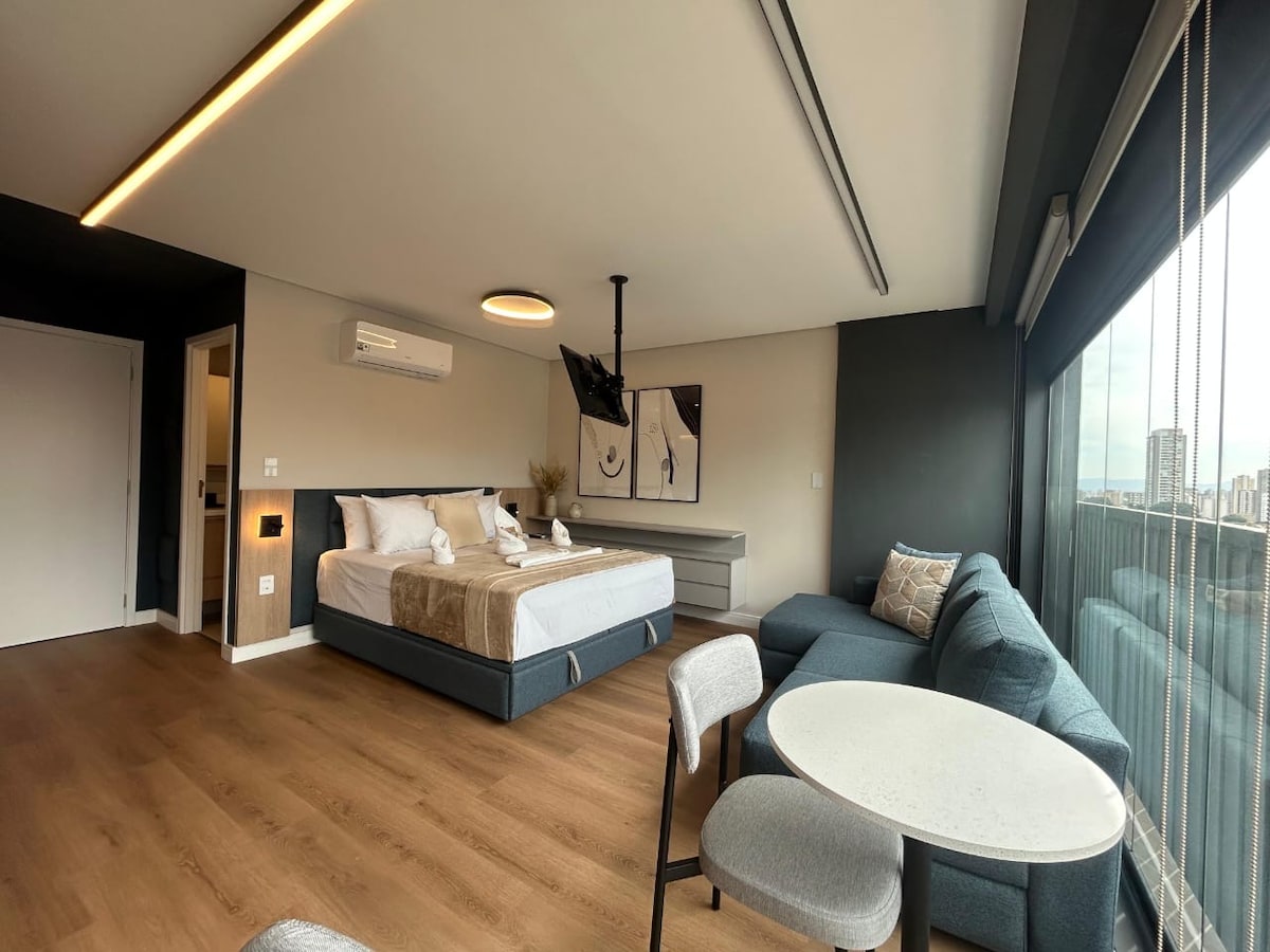 Estudio moderno completo con vaga, TV de 75" y wifi