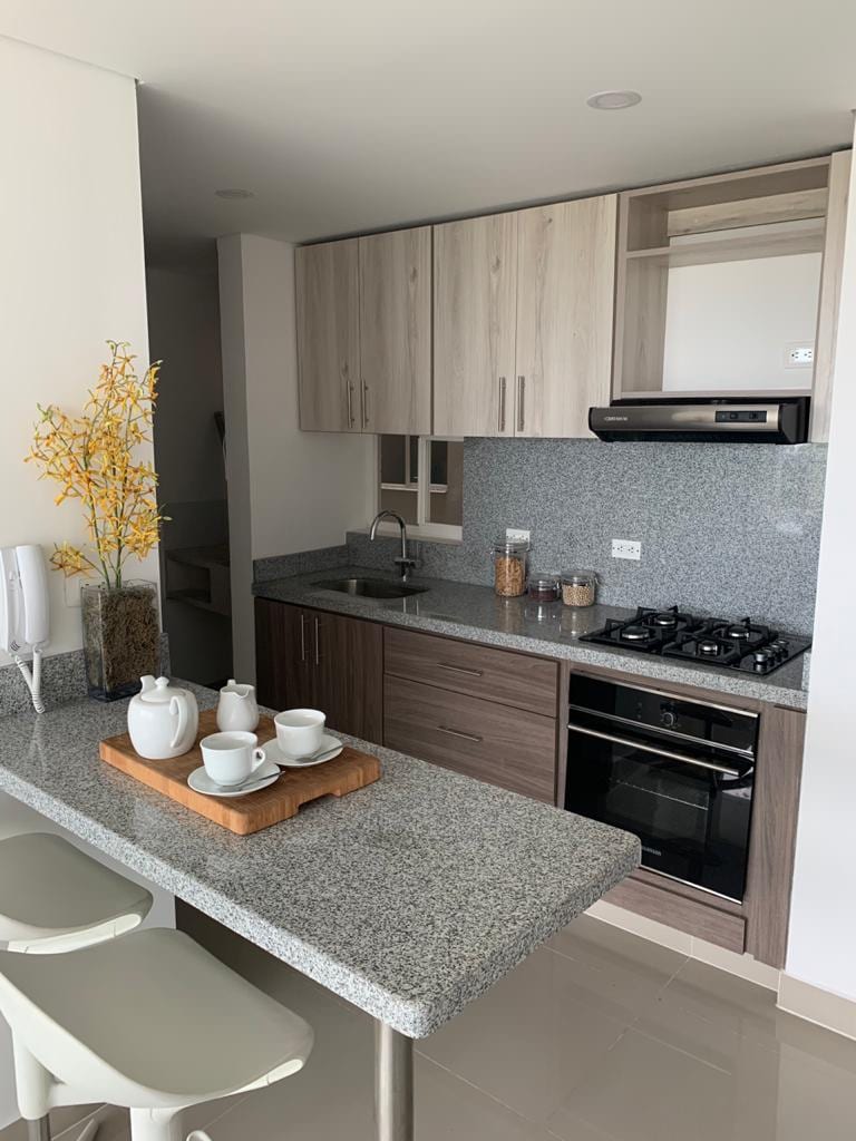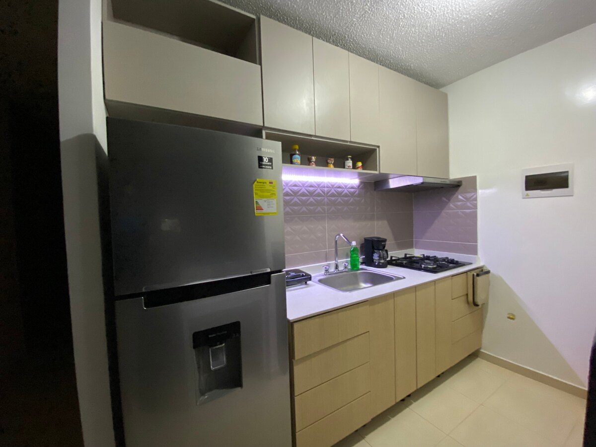 Un apartamento nuevo, comfortable e ideal para disfrutar de una aventura solitaria o en familia. El clima no es un problema porque su habitaciones cuentan con aire acondicionado, además de la hermosa cocina en la que dará gusto preparar tus alimentos. Este lugar cerca al aeropuerto, terminal de transporte, el centro de la ciudad, centros comerciales y una ruta rápida para llegar a los lugares más turísticos de la ciudad.