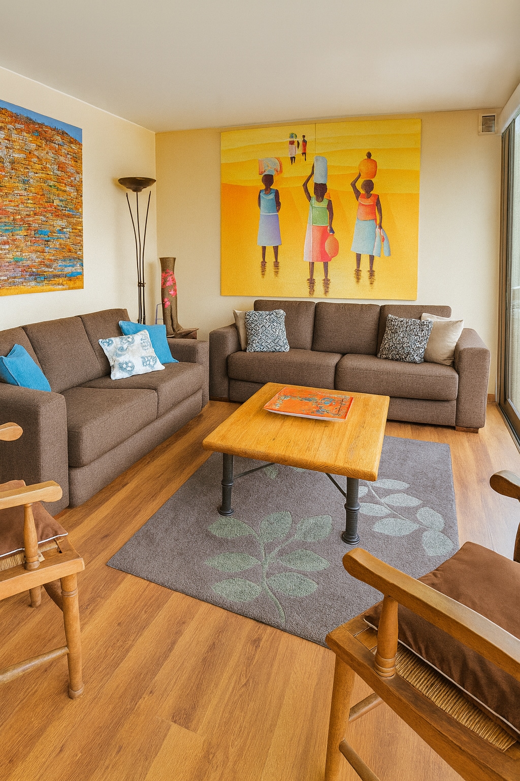 Cómodo departamento para 4 personas, con un ambiente cálido y luminoso, con todo lo necesario para hospedarse con tranquilidad. Wi fi rápido, TVs inteligentes, canales streaming, lavadora y cocina totalmente equipada. Cuenta con conserjería 24/7. El edificio cuenta con piscina, cafetería, farmacia, peluquería y otros.