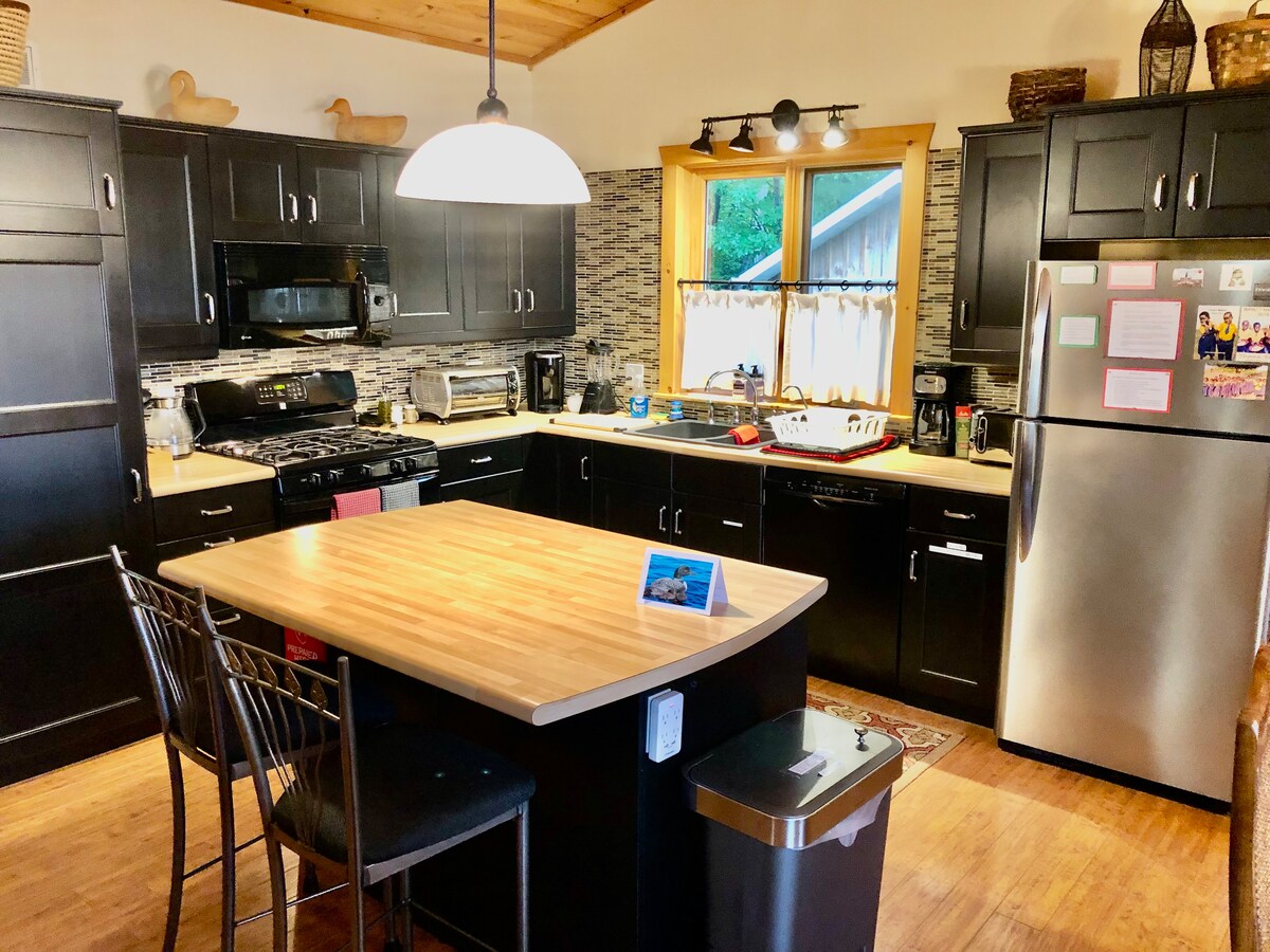 Imagine vacationing on a beautiful lake with everything you need to enjoy time on the water – kayaks, canoes, paddle boards, pedal boat and rowboat. . Inside is a fully equipped kitchen, very comfortable beds, central air-conditioning, walk-in shower and soaker tub. We have an entire house R/O system, so all the water from every tap is perfect. We live on a bay with many weeds. To swim you must paddle out to a raft. There is a small sandy beach with a wading area for the little children.