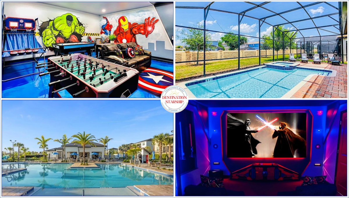 Buscas una casa para vacacionar que ha sido totalmente renovada con un increíble teatro, sala de juegos, piscina/spa privados y dentro del Resort ChampionsGate? Esta es tu casa! - 8 Cuartos (2 master) - Cuartos temáticos para niños - Sala de Juegos con Xbox One & PS4 - Starship Cine in Casa 120" 4K - Piscina y Spa ($30/día extra) - y acceso gratis al Oasis y Retreat Club houses. A 20-30 min de todos los parques temáticos, shopping, restaurantes y del Aeropuerto Int'l Orlando