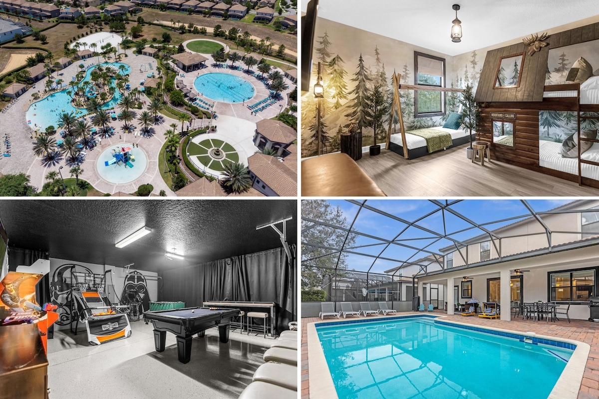 ¡Escápate a tu alojamiento de ensueño de Disney a pocos minutos de los parques! Esta villa de 5 dormitorios tiene capacidad para que tu familia duerma cómodamente y cuenta con una piscina privada climatizada y spa, parrilla para barbacoa, habitaciones temáticas divertidas y una sala de juegos. Disfrute de acceso completo al río lento, los toboganes acuáticos y el gimnasio del centro vacacional Champions Gate. Perfecto para unas vacaciones familiares inolvidables en Orlando.
