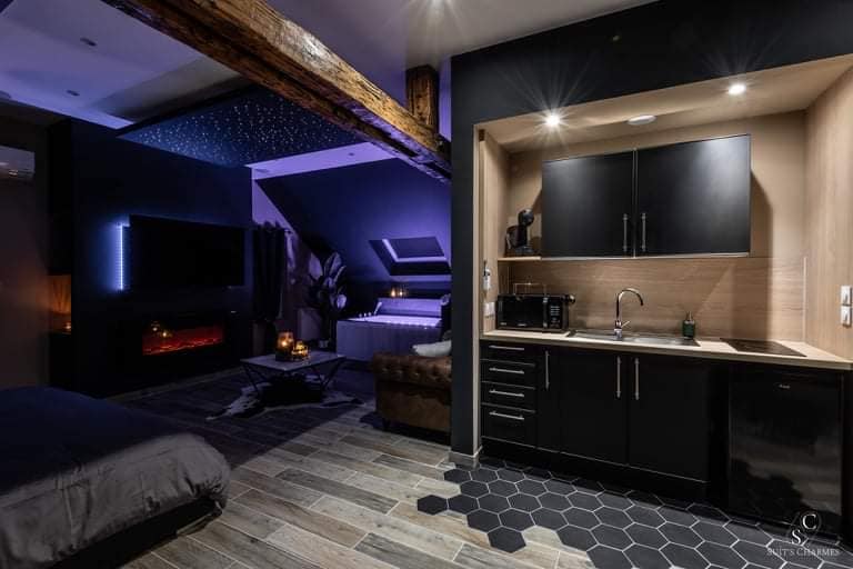 La Suit's Charmes le da la bienvenida en un ambiente cálido, acogedor y relajante. Soñar, descansar, mirarse, sentirse, abrazarse, reencontrarse, confinarse... Amarse... ¡Ven a disfrutar de los encantos de la suite! Suite de 75 m2, frente a la estación de Belfort Jacuzzi Sauna Cama King Size Televisión 4K Smart TV, Netflix, TV Orange Wifi Chimenea Cielo estrellado Ducha XXL multichorro (cielo de ducha no disponible hasta la fecha) Ropa de cama incluida Opción posible: columpio erótico/ champán/ electrodoméstico party