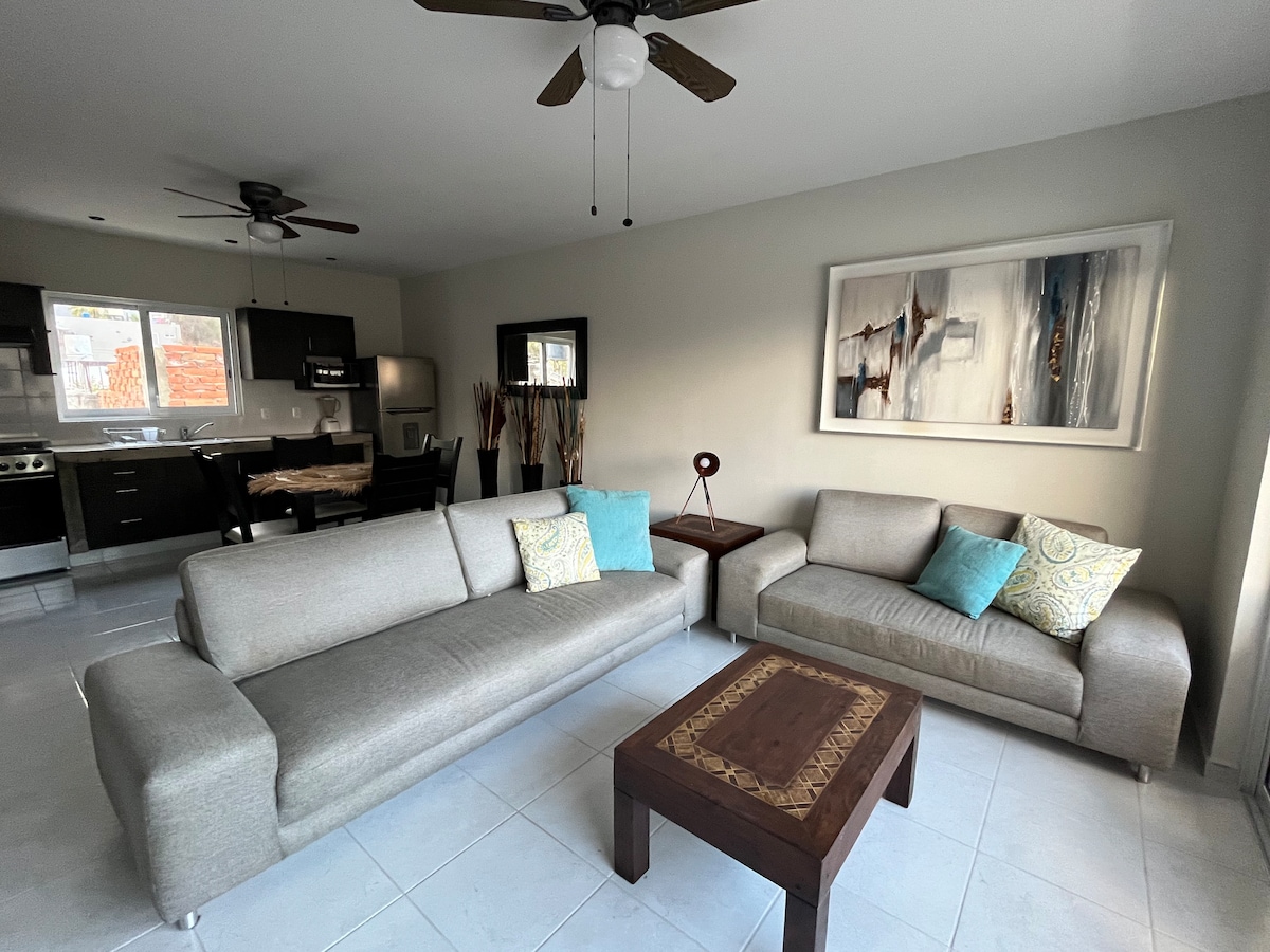 Tendrás uso de nuestra palapa y piscina climatizada, y tenemos excelentes restaurantes cerca. Villa Nova es un vecindario encantador al oeste del pueblo. Nuestros amistosos perros, Chaquita y Rosie, querrán un saludo, pero puedes cerrar el área cerrada del jardín para mayor privacidad. Tendrás nevera, plato caliente, cafetera, microondas, platos y parrilla. No se admiten niños menores de 12 años, por favor, debido a la piscina. La suite es perfecta para 1 a 4 personas, no más de 4.