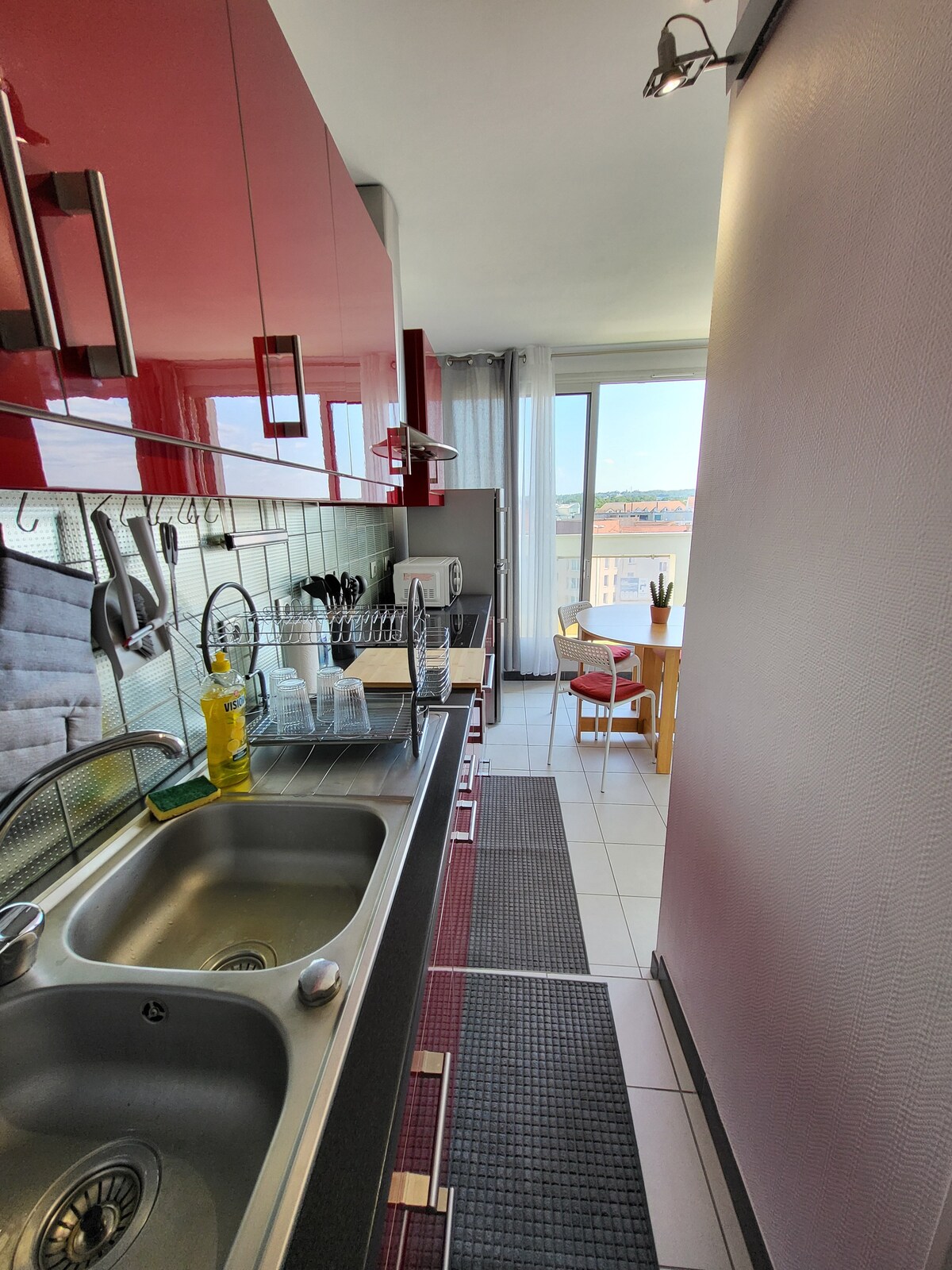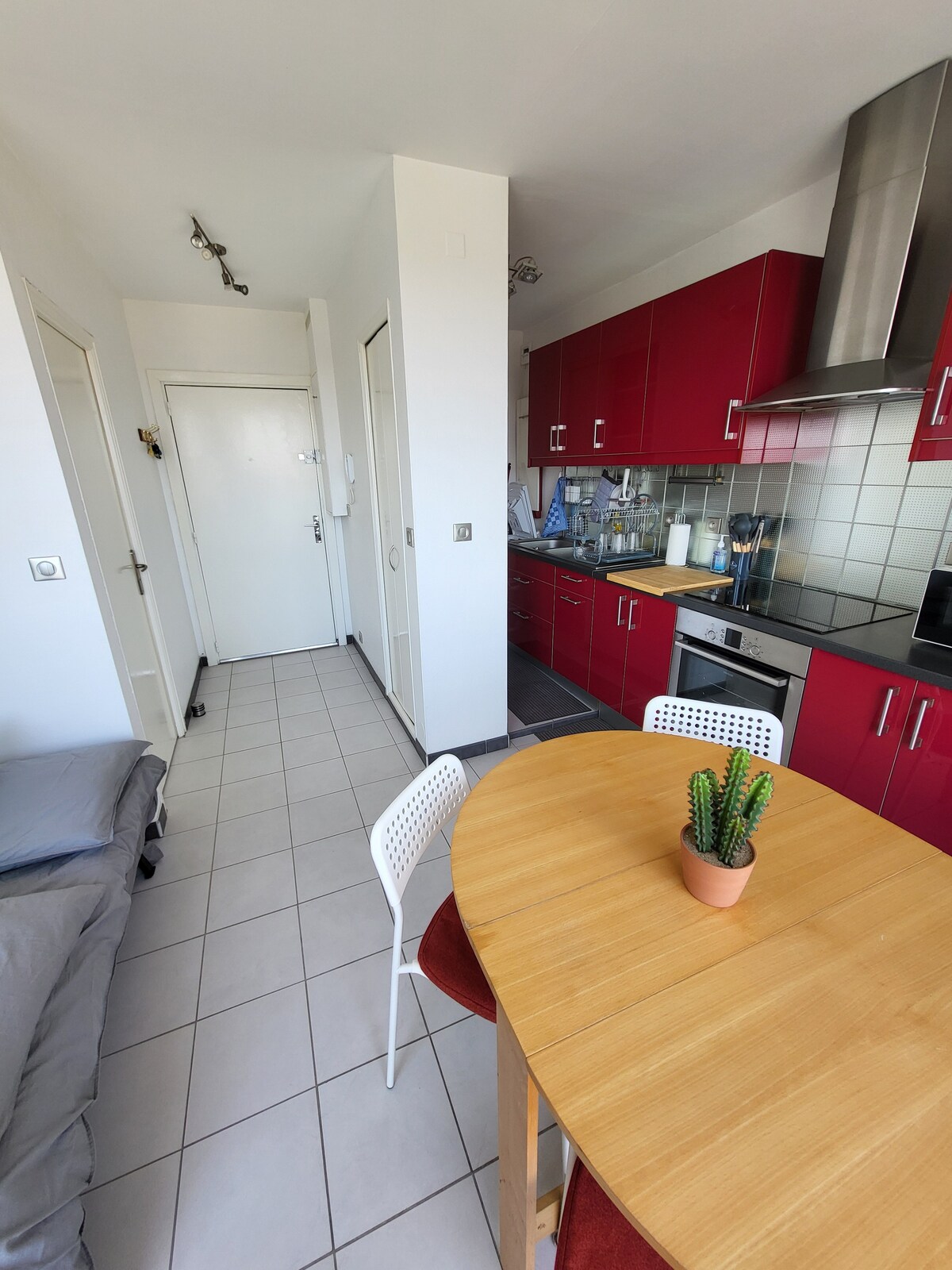 Apartamento F2 dúplex 1 salón comedor + TV y cocina equipada 1 sofá cama para 2 personas de 160 cm x 190 cm 1 habitación doble arriba para 2 personas de 160 x 200 + TV 1 cuarto de baño con ducha de 100 x 80 + lavabo + inodoro + lavadora Comercios de proximidad: Panadería, carnicería, supermercado, farmacia, restaurante y estanco Se encuentra a unos: 5 km de Claye-Souilly 10 km de Meaux a 15 km de Roissy Charles de Gaulle 20 km de Disneyland y Val d'Europe 20 km del parque Astérix 30 km de París ⚠️ accesible a través de escaleras