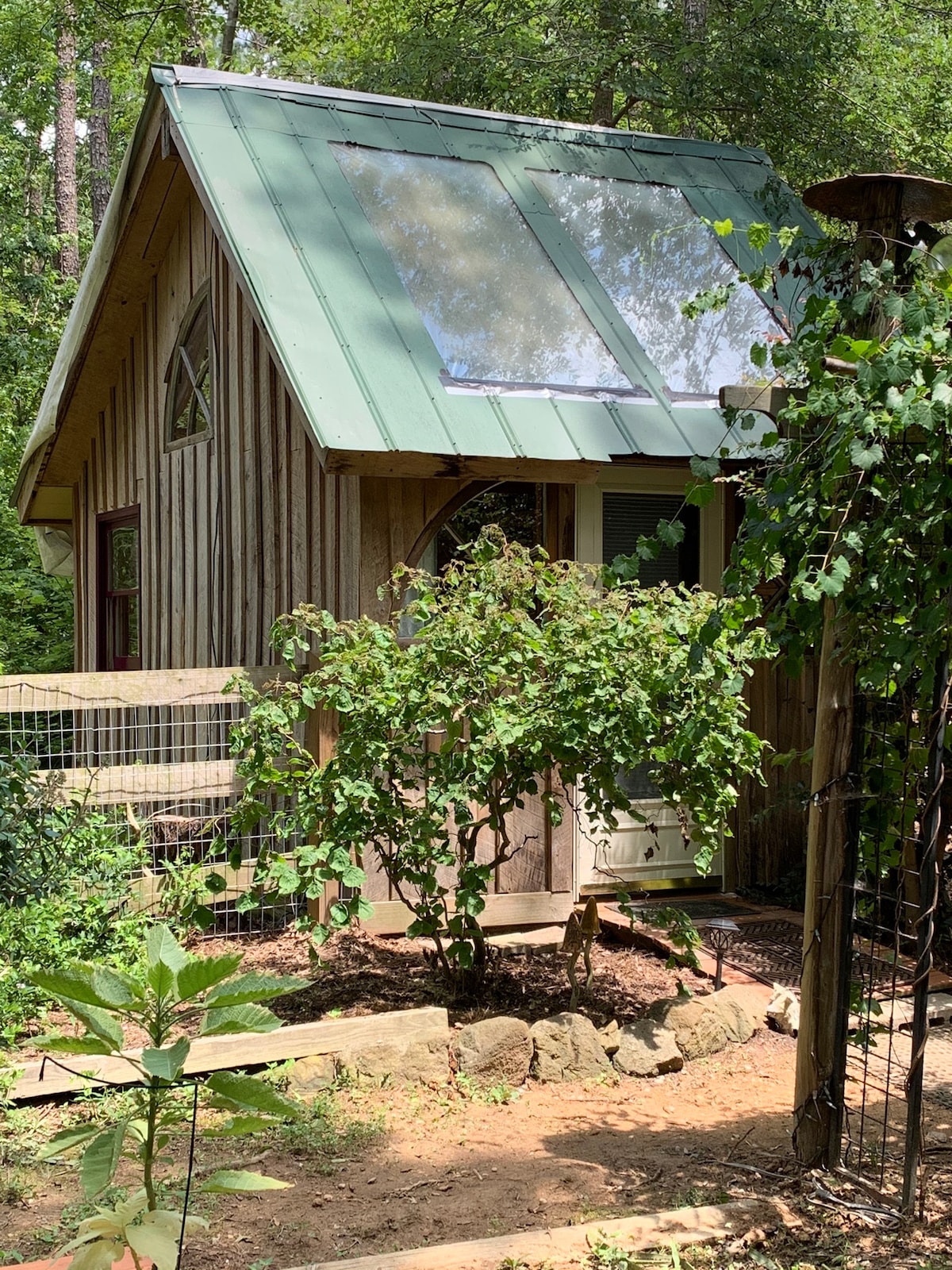 Esta es una casa de huéspedes acogedora e independiente de una habitación. El edificio estaba hecho de un granero de postes y vigas del siglo XIX en una granja cercana. El espacio es elegante con hermosos espejos y luces de vidrieras. La habitación individual tiene una cama doble, sofá completo y un pequeño escritorio de escritura/computadora. Los huéspedes de esta casa de campo utilizan una casa exterior cercana con inodoro de compostaje y lavabo de manos. Hay una hermosa ducha al aire libre con agua caliente/fría a pocos pasos de la cabaña. Este lugar está ubicado en mi parche de bayas y árbol de uva.