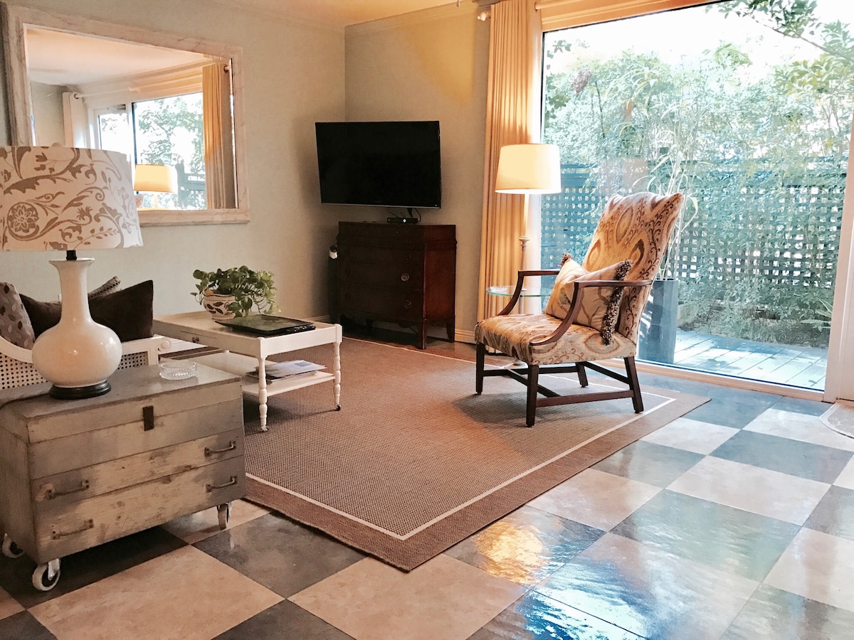 A poca distancia a pie de Canton St. y a poca distancia a pie de lugares para bodas locales. Este nuevo apartamento en el sótano con jardín tiene una cocina completamente equipada, un gran baño doble con tocador, una sala de juegos/billar completamente equipada y una oficina privada separada. Techos de 10 pies en toda la unidad y se abre a jardines compartidos en el patio trasero y patio privado. Cama tamaño king. Tu propia entrada y acceso privado. Aunque no están 100 % insonorizados, tanto arriba como abajo hay un horario de silencio entre las 22:00 y las 7:00. No se permiten fiestas.