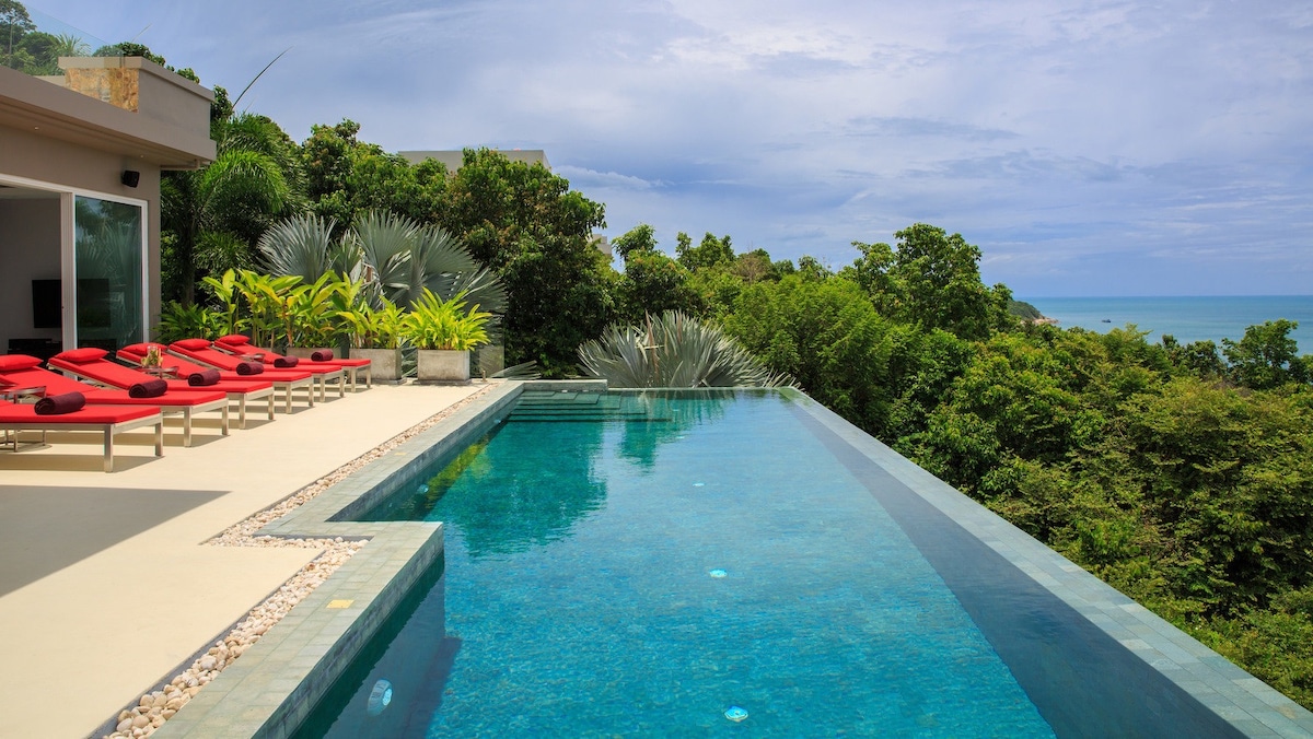 Villa privada de lujo de 620 m² con vistas al mar de 180° sobre las colinas de Chaweng → Desayuno y limpieza diarios. Piscina infinita de→ 25 metros de altura. → Gimnasio, billar, dardos y tenis de mesa → Hospitalidad con personal 24/7 en el lugar (inglés, tailandés) Bañera de hidromasaje de→ hormigón → Cada dormitorio con baño privado Internet → de alta velocidad y wifi → Televisión inteligente con Netflix Sistema de sonido→ Bose → Café y agua potable gratis → Agua y electricidad incluidas → 10 millones en auto a las playas → Más servicios disponibles bajo petición