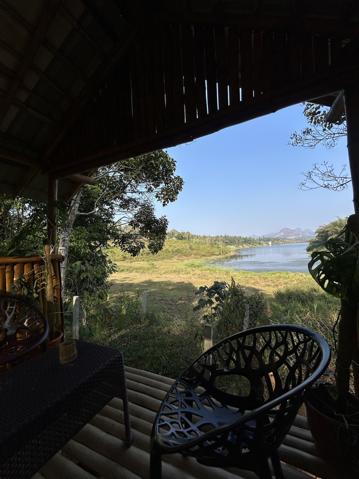 carpa lupa :2 cabaña de bambú frente al agua, wayanad