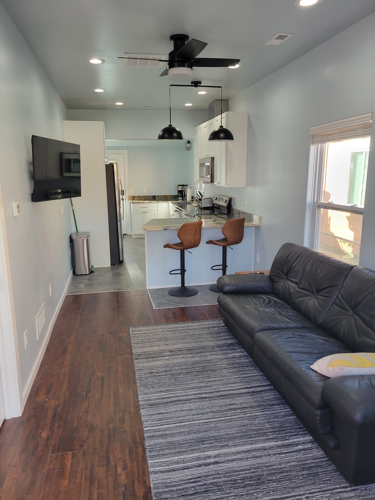 Take it easy at this self-contained getaway. Entrance at side of house, combination lock (which locks by itself after 60sec). Perfect for one, could fit two snugly if they share the twin bed. Low (6’ 2”)ceilings. Low shower. The plumbing rumbles when the pump runs. Outdoor areas are the only shared areas. Family members may go out the side door at times. The unit is pet friendly, you can bring your animal. If you are allergic to pets/are over 5’10” the unit might not be a good fit.