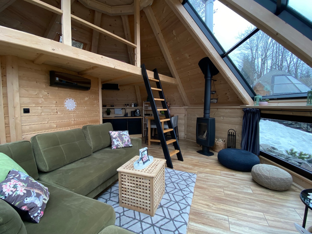 W Osadzie znajdą Państwo 5 domków typu Islandia z przeszklonym panoramicznym dachem. Do każdego z domków przynależy prywatna balia, taras z kompletem wypoczynkowym oraz grillem. Domki są w pełni wyposażone i posiadają osobny dostęp do sieci Wi-Fi, co umożliwi Państwu połączenie wypoczynku z pracą zdalną. Każdy z domków posiada przestronny salon z kominkiem oraz antresola, z której w ciągu dnia mogą Państwo podziwiać panoramę gór, z kolei nocą niebo pełne gwiazd.