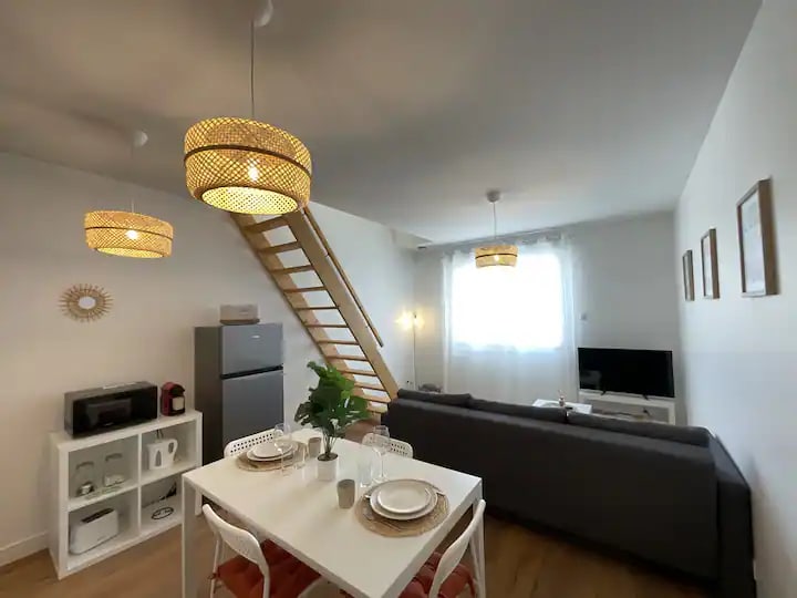 Estudio cálido y moderno situado cerca de múltiples tiendas y a 15 minutos a pie del centro de la ciudad de Le Mans. Bienvenido a mi apartamento situado en el tercer piso con ascensor en una residencia tranquila. Una plaza de aparcamiento privado en la urbanización está a su disposición. Este estudio consta de una amplia sala de estar con una bonita cocina abierta equipada, con café, té y condimentos a su disposición. También dispone de un baño con bañera.