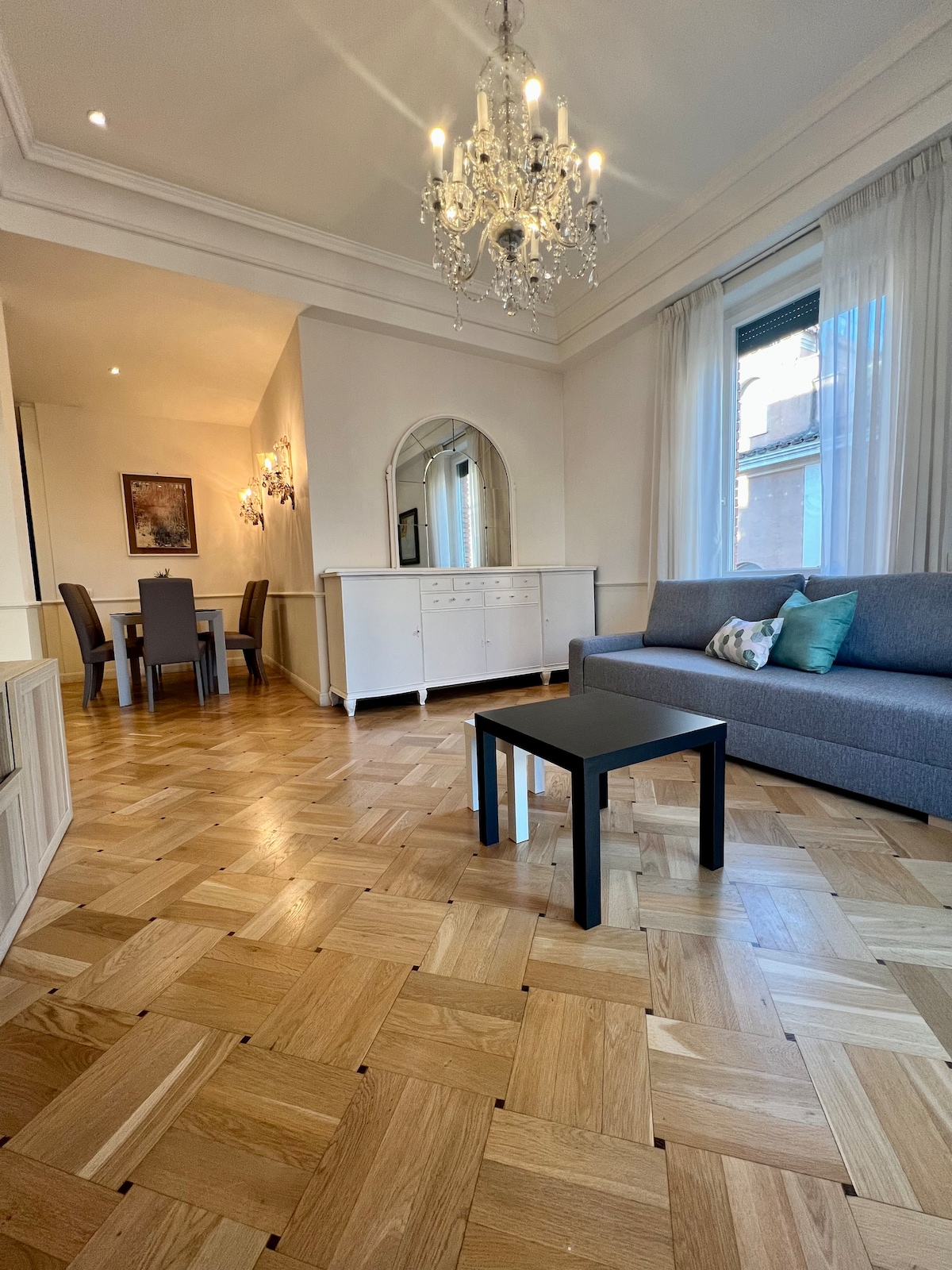 Apartamento recién reformado y espacioso iluminado por el sol en un edificio histórico ubicado en el cuarto piso (con ascensor). Salón-comedor, 3 balcones; 2 dormitorios grandes con 4 camas, baño y cocina completa con horno, lavadora, lavavajillas, microondas. Parqué y pisos originales. Aire acondicionado, wifi de fibra de alta velocidad y TV. A poca distancia del Coliseo, el Foro Romano, el Circo Máximo, restaurantes, metro al aeropuerto y el Vaticano. Hay una cuna disponible bajo petición por un cargo adicional.