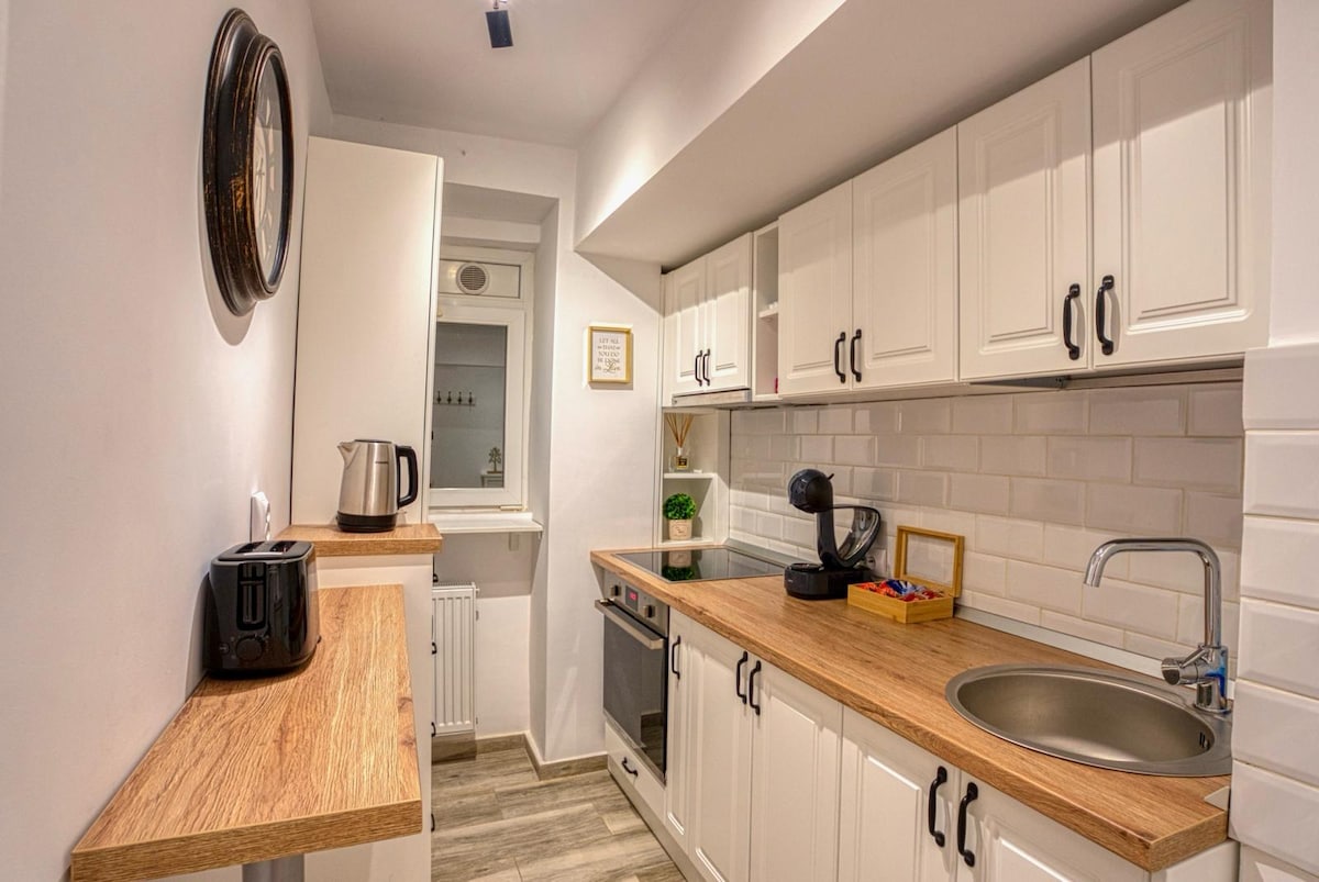 Stay in a stylish modern-retro apartment in the heart of Bucharest Old Town, just across the National Bank — one of the most central and safest locations in the city. Tucked away towards an inner courtyard, the apartment offers a calm and comfortable retreat, with fast WiFi and everything you need for a smooth and enjoyable stay. Thoughtful extras such as board games and family-friendly touches are also available to make the space feel even more welcoming.