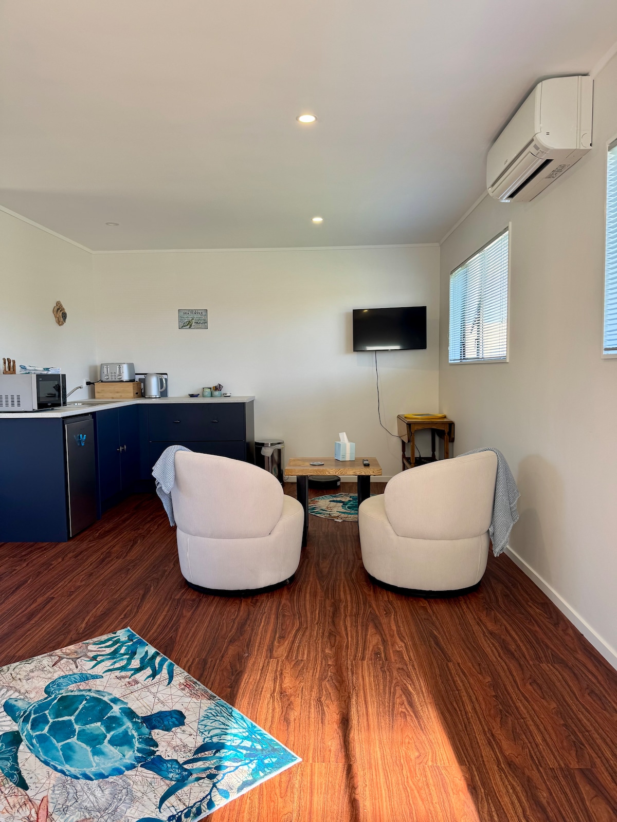 Un dormitorio independiente al otro lado de la carretera de la playa en Te Awanga, totalmente equipado para una estancia cómoda. Un estudio espacioso con una cama tamaño queen, sofá cama (para dos niños o un adulto), mesa de comedor, TV de pantalla plana, wifi y desayuno continental. Hay una cuna disponible. La cocina cuenta con microondas, horno de sobremesa, utensilios de cocina y nevera. El baño tiene una ducha de tamaño decente con buena presión de agua y agua caliente calentada por gas. A solo 15-20 minutos en coche de Napier o Hastings.
