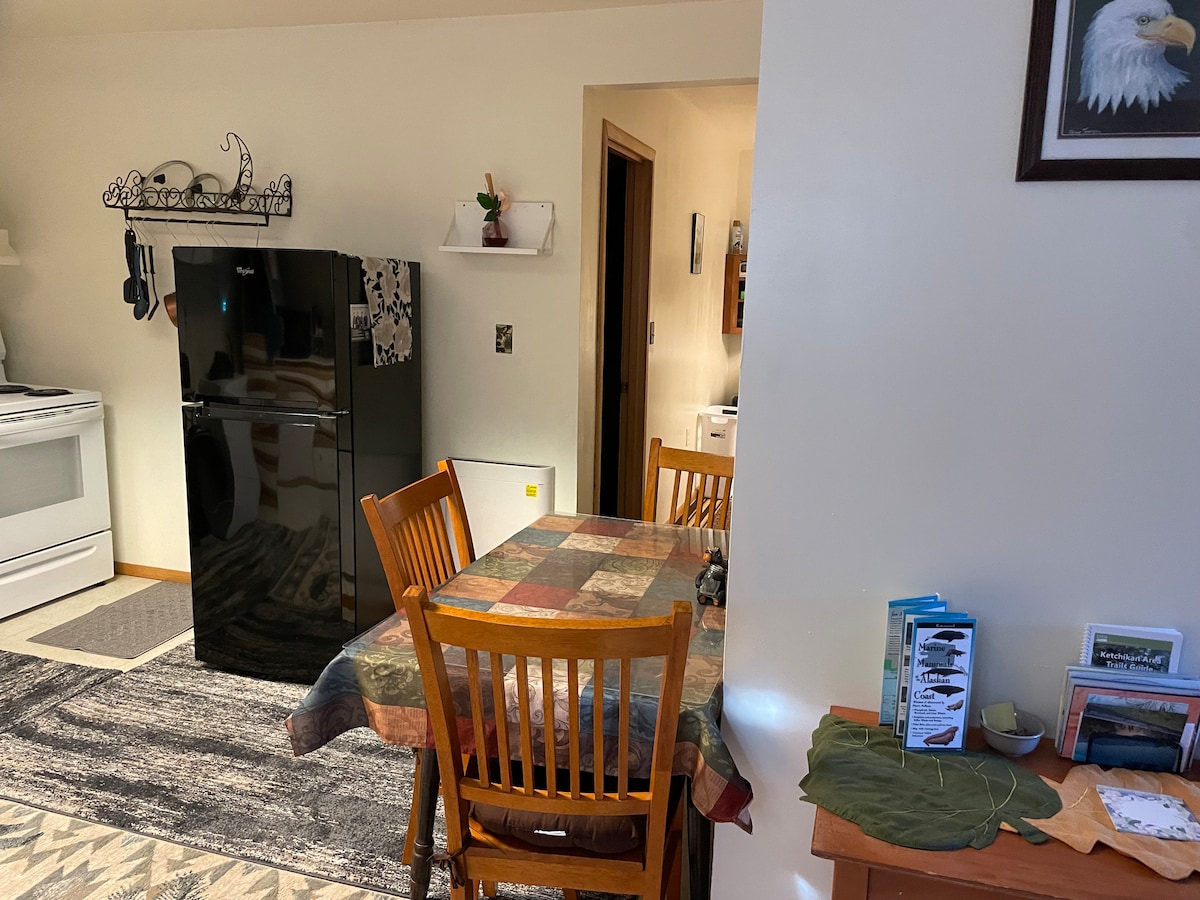 ¡La casita más nueva de Ketchikan! Disfruta de este nuevo apartamento privado a solo 10 millas en coche al norte del centro de la ciudad, a 5 millas de Knudson Cove Marina y del centro de pesca Clover Pass Resort. La nueva construcción te ofrece una cocina con cocina de doble hornilla, muebles de cocina completos para cocinar/comer, microondas y horno de encimera. Tu propia lavadora/secadora en la unidad. Cama tamaño queen. Sofá para relajarse. Mesa de comedor. TV inteligente y wifi ilimitado. Aparcamiento privado y entrada privada con código clave.