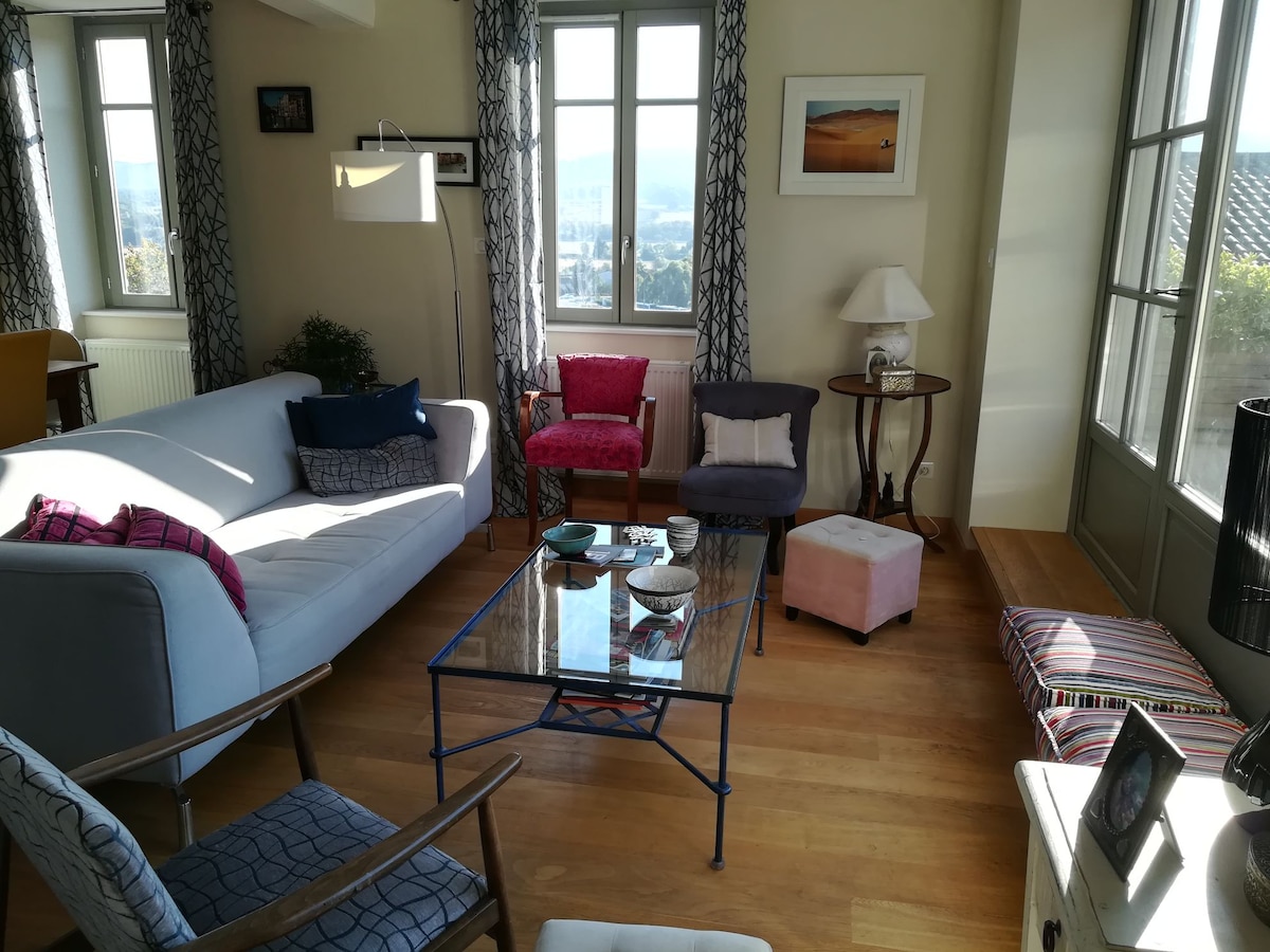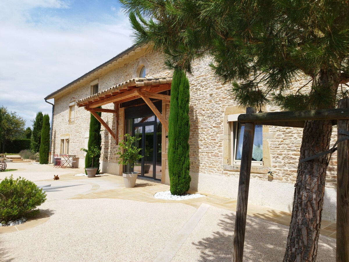 Alojamiento con carácter (antiguo priorato del siglo XVII) con un encanto íntimo y romántico, en la costa de Mâcon. El alojamiento está rodeado de viñedos, en un pueblo patrimonial, con un encanto inigualable. El alojamiento está situado en la ruta del vino y en el circuito de las iglesias románicas. El alojamiento está equipado con todo lo necesario para pasar una estancia llena de encanto, descubrimiento y tranquilidad.