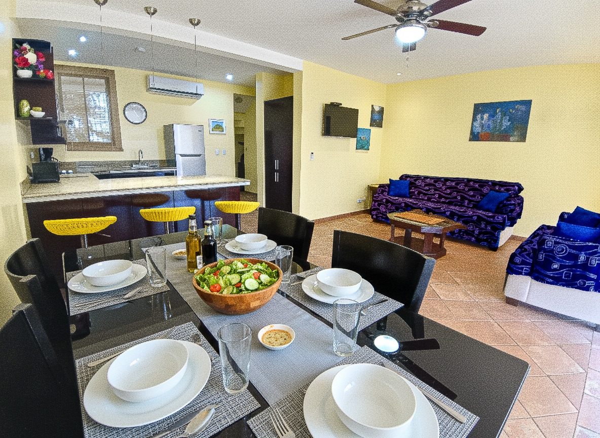 ¡Disfruta de la vida frente a la playa, las majestuosas vistas y las puestas de sol desde tu propia terraza privada, patio o piscina! Este magnífico apartamento de 1 dormitorio y 1 baño tiene una cama tamaño king, baño privado y la cocina tiene una gran isla y está totalmente equipada con todos los utensilios de cocina que necesitas para disfrutar de cenar en casa. Tendrás una amplia sala de estar y una terraza cubierta para disfrutar de las fabulosas vistas al mar de las islas Catalina, el puerto deportivo de Flamingo y la bahía de Potrero. A solo una hora del aeropuerto de Liberia.