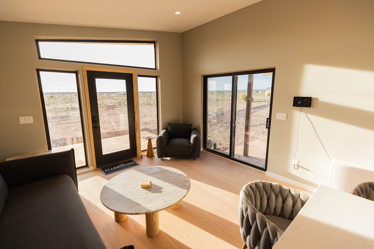 ¡Mantente abrigado este invierno y disfruta de duchas calientes en interiores! ¡Quédate más tiempo y ahorra! ¡Descuentos agregados en su segunda noche (+) hasta finales de abril! Descubre la comodidad y la serenidad en nuestra minicasa, a solo 30 minutos de la entrada del Gran Cañón. Disfruta de impresionantes amaneceres sobre las montañas, contempla las estrellas sin contaminación lumínica y relájate en nuestra propiedad de 15 acres (6 ha). Perfecta para los amantes de la naturaleza y los aventureros, esta joya remota ofrece comodidades modernas, una acogedora sala de estar interior y un amplio espacio al aire libre.