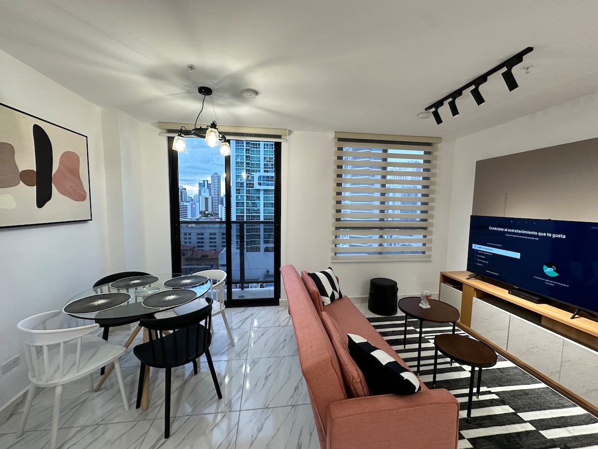 Hermoso departamento ubicado en el piso 54 del más lujoso edificio de Panama. Areas diseñadas por el Diseñador Philip Stark. Tiene 134 metros, está completamente amoblado, cuenta con un dormitorio, walking closet, un baño completo, sala comedor y cocina abiertos, medio baño social, terraza, cuarto de lavado. El edificio es un lugar único, con áreas comunales especiales y lujosas; 2 elegantes restaurantes; 2 piscinas; Gym; SPA; 2 canchas de squash; salsa de póker, lobby con mesa de billa, etc.