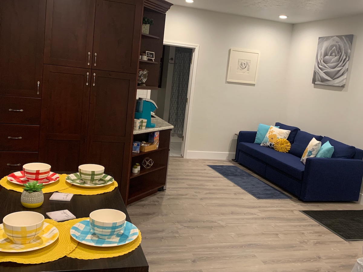 Este es un pequeño y hermoso apartamento con patio privado y estacionamiento. Se encuentra a pocas cuadras de la autopista para acceder fácilmente a muchos parques y atracciones locales sin dejar de ser tranquilo y hogareño. El patio privado está preparado para disfrutar de la luz cambiante en las hermosas montañas de la zona y las suaves noches iluminadas por las estrellas del alto desierto. Incluye una cocina completa, bañera de hidromasaje y lavadora/ secadora. Cómodo y elegante sin dejar de ser acogedor.