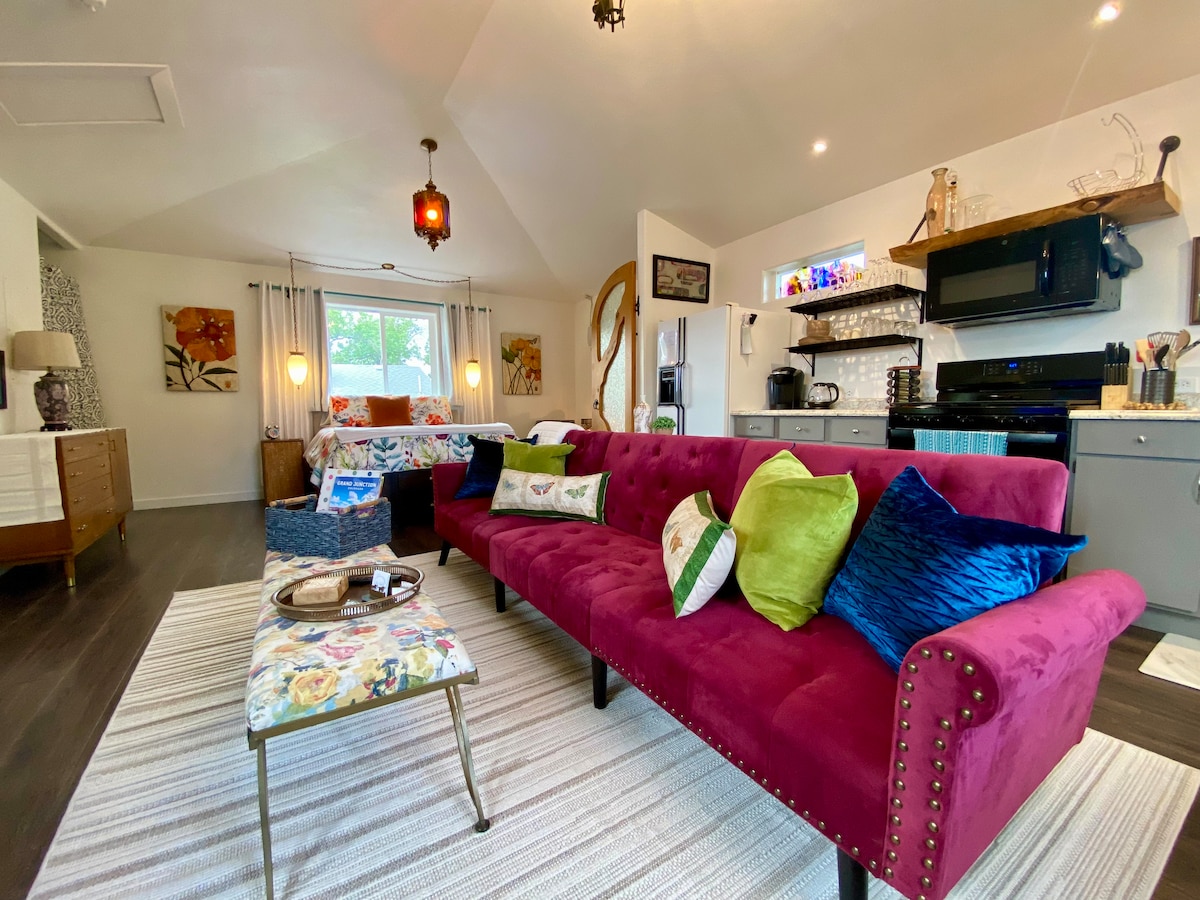 Relájate y desconecta en este alojamiento tranquilo y elegante. Entra en los 5 acres cerrados en un exuberante oasis verde. El estudio tiene una terraza soleada y acogedora con mesa cubierta con sombrilla, muchos asientos y zona de descanso. Estudio recién remodelado con cocina completa que incluye encimeras de granito, estantes flotantes y mucha luz natural. La acogedora sala de estar tiene un moderno sofá de cuero de mediados de siglo y una mesa de centro con tapa elevadora para trabajar. Sube la escalera hasta la zona de literas del loft con 2 camas tamaño queen.