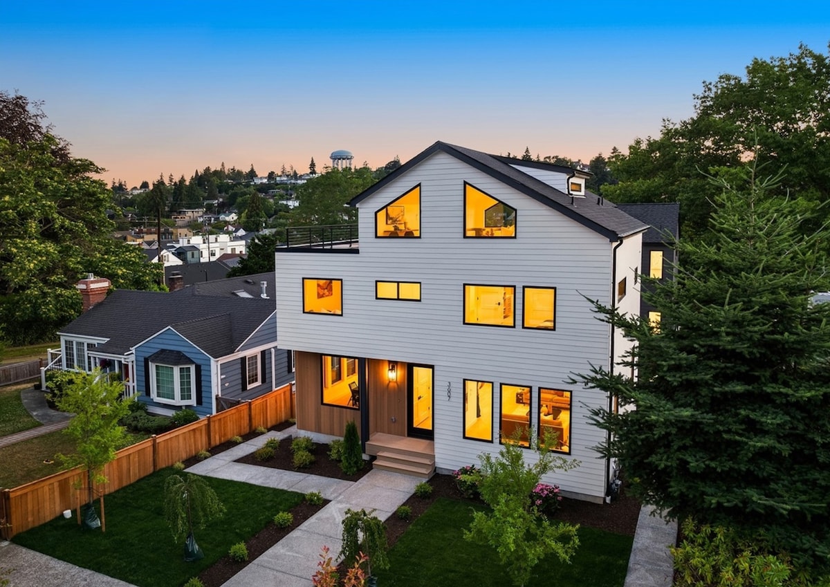 Spacious modern luxury home in Seattle’s Magnolia neighborhood with rooftop views. High-end finishes, multiple living areas, full kitchen, yard, and rooftop deck. Located in a quiet residential area close to downtown, Ballard restaurants, parks, and waterfront. Ideal for families and groups.