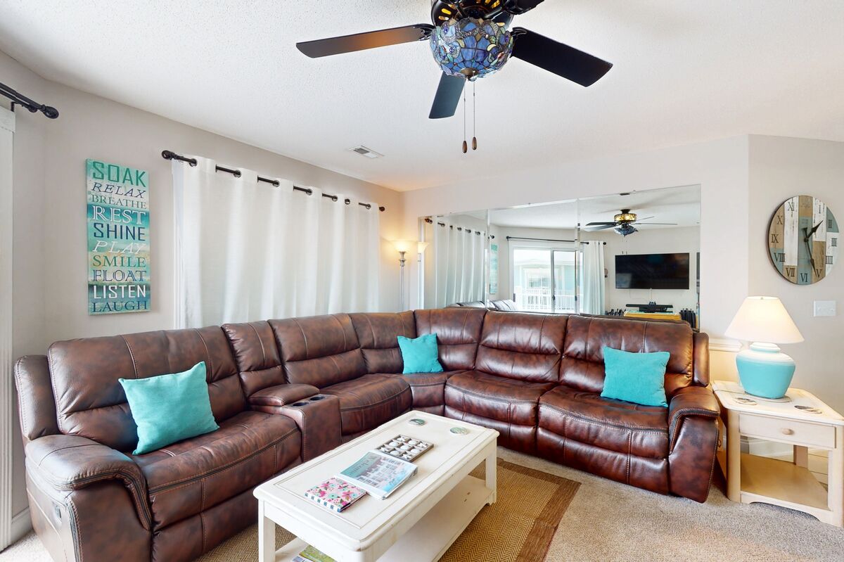 Unidad de 2 dormitorios/2 baños en la planta baja en el campo de golf, capacidad para 4-6 personas Luminoso espacio habitable con puertas corredizas de vidrio en la sala de estar, TV de alta definición de 55 pulgadas y grandes ventanales en el comedor. El dormitorio principal cuenta con una cama tamaño king, TV de alta definición y bañera. El segundo dormitorio cuenta con 2 camas de matrimonio, TV de alta definición, una pequeña cocina y un baño privado con bañera. Cocina totalmente equipada con cafetera, lavavajillas y máquina de hielo. Lavadora y secadora incluidas para tu comodidad. Se proporcionan sábanas y toallas. Transmisión de Roku incluida.
