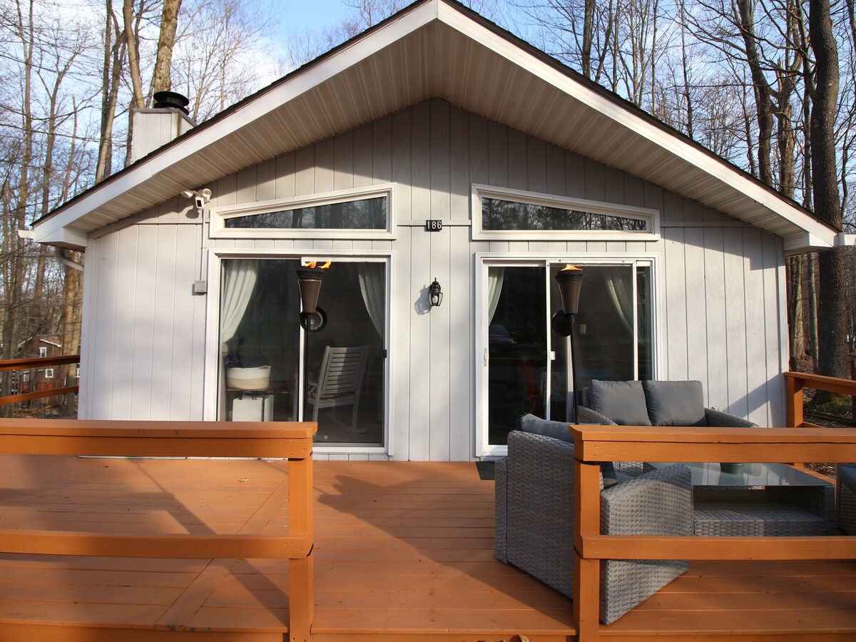 Escápate a una acogedora escapada de otoño cerca de Kalahari, Mount Airy Casino, Crossings Outlets, Lake Wallenpaupack y Tobyhanna State Park a 2 millas de distancia con follaje de otoño y aire de montaña, vistas al lago, vida silvestre y lugares de picnic. Ubicada en una carretera privada escarpada. Este refugio de estilo spa tiene una bañera de inmersión, ducha con efecto lluvia, luces inteligentes, cocina con estufa inteligente, camas lujosas, espejos LED con sincronización de música y diversión arcade retro. Perfecto para parejas, escapadas de cumpleaños o familias que buscan una estancia tranquila en Poconos con comodidades modernas.