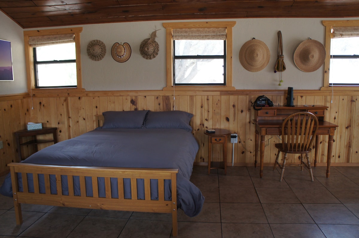 Esta exclusiva cabaña de estuco aislada recientemente remodelada está rodeada por el desierto de Gila. Ubicada en la base de la montaña, es la escapada perfecta para los amantes. La cabaña de una habitación es acogedora y cómoda, y está amueblada con buen gusto con obras de arte que representan la zona. La cocina cuenta con nevera, fogones, microondas y cafetera. Viene equipada con platos, ollas y sartenes. Tu patio privado es el lugar perfecto para disfrutar de una copa de vino mientras te sumerges en los colores del atardecer.