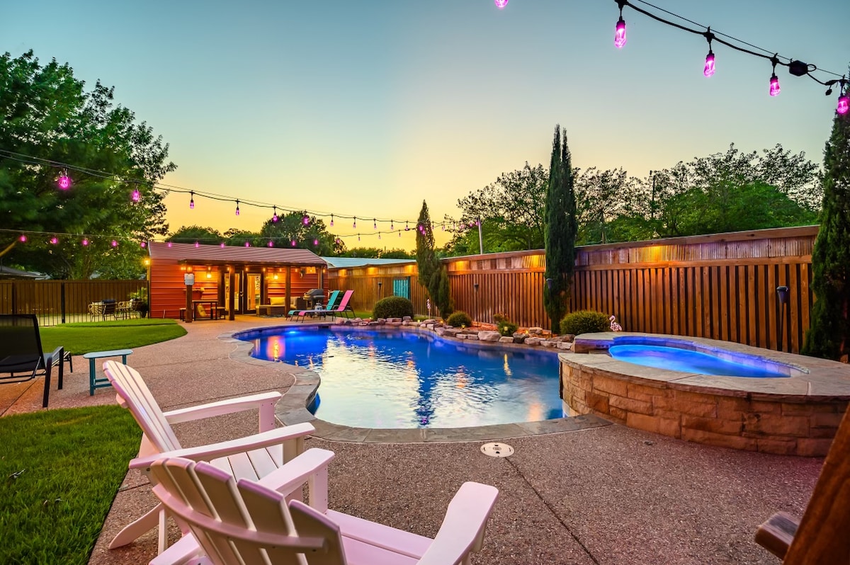 Bonito y acogedor refugio con capacidad para 2-4 personas ubicado en la hermosa ciudad de Denton, Texas. La acogedora almohadilla está muy limpia con un ambiente rústico que se abre a un hermoso oasis de piscina / jacuzzi en el patio trasero. Perfecto para una escapada en pareja o simplemente una noche lejos del mundo cotidiano. El propietario vive en el lugar en la casa principal que está separada del retiro. La piscina rara vez se comparte cuando estoy en casa. ¡Por $ 40 más por día, podemos asegurarnos de que la piscina sea privada para tu escapada romántica!