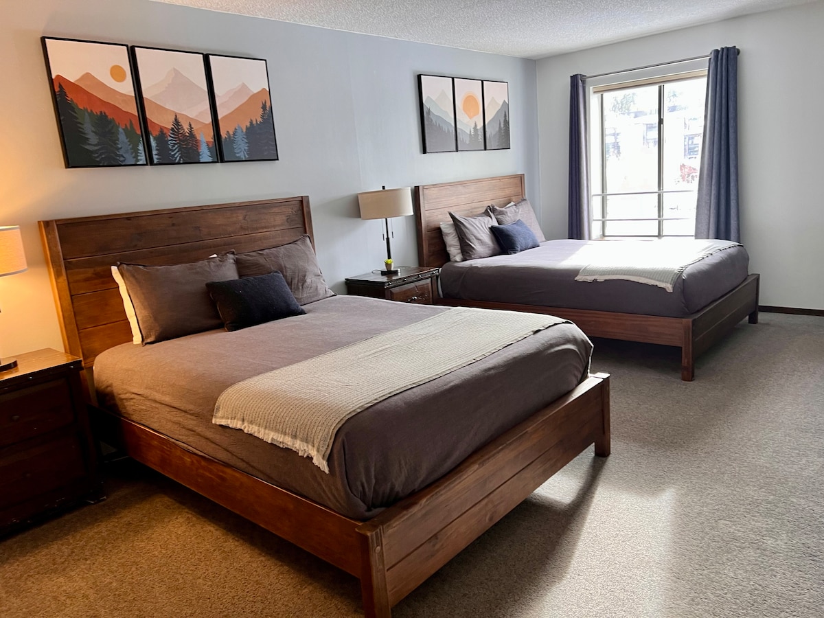 Esta es una habitación con cerradura estilo hotel con 2 camas tamaño queen ubicada en el centro de Copper Mountain. A pocos pasos de los remontes American Eagle y American Flyer con vistas a la montaña. Con una ubicación céntrica cerca de todos los restaurantes, bares, tiendas de alquiler, tiendas y taquillas.