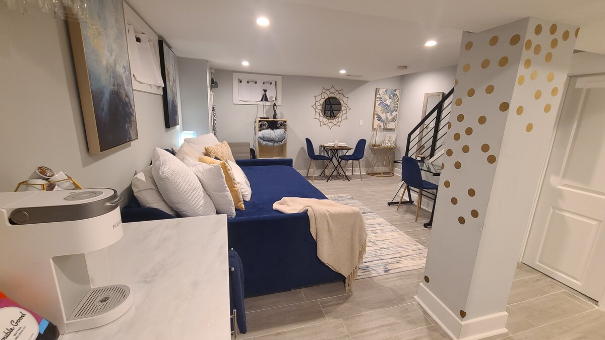 Un bonito apartamento tipo estudio en el sótano de una casa recién reformada. Los huéspedes tienen una entrada privada con su propio baño privado. También puedes utilizar una lavadora y secadora de tamaño completo. Otros servicios incluyen un bar de honor surtido de cerveza y vino, un juego de estilo arcade con más de 200 títulos populares, incluido Ms. Pac Man, y café/té. Ten en cuenta que vivimos arriba, pero el espacio es privado. Está separado por una escalera y una puerta con cerradura. Es comparable a una habitación de hotel, pero más agradable.