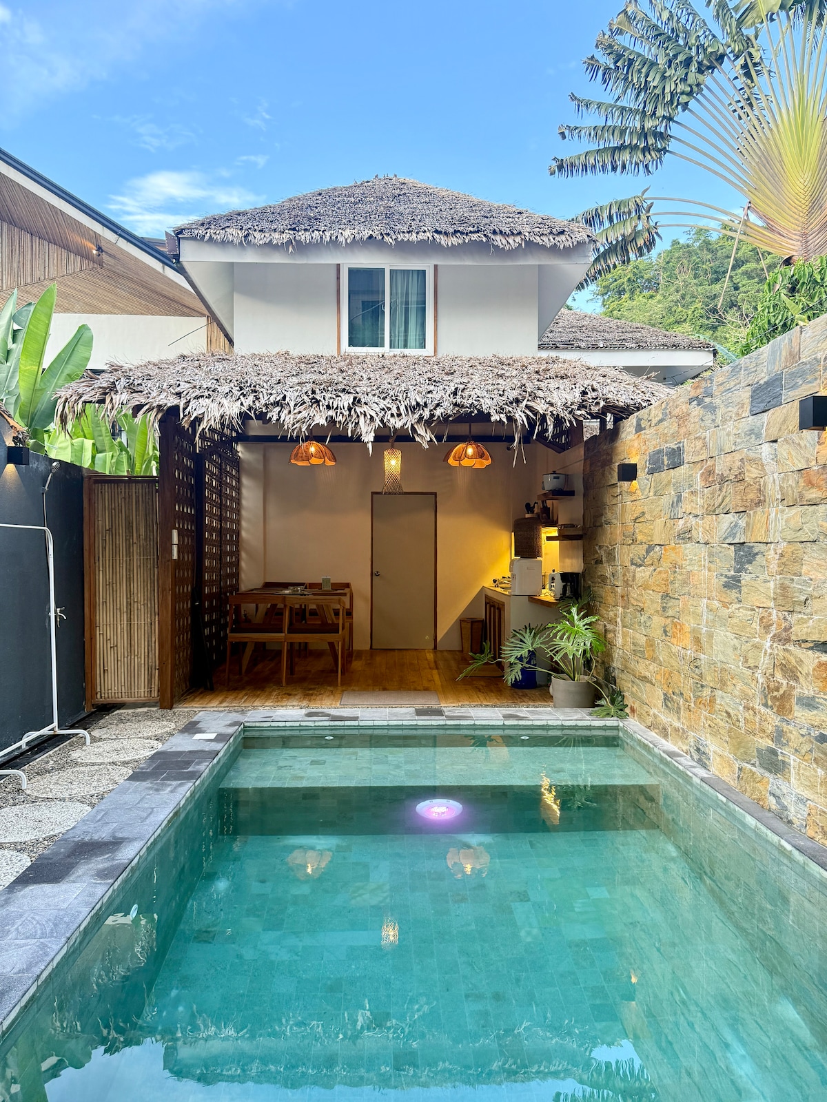 Encantadora villa tropical con piscina privada, ideal para una estancia cómoda y relajante en El Nido. Ofrece 2 dormitorios con camas tamaño king, un baño moderno y una sala de estar abierta que combina sala de estar, comedor y cocina totalmente equipada. En el exterior, disfrute de su piscina privada rodeada de vegetación y un estacionamiento exclusivo. Un lugar tranquilo y cálido, perfecto para parejas, familias o amigos.