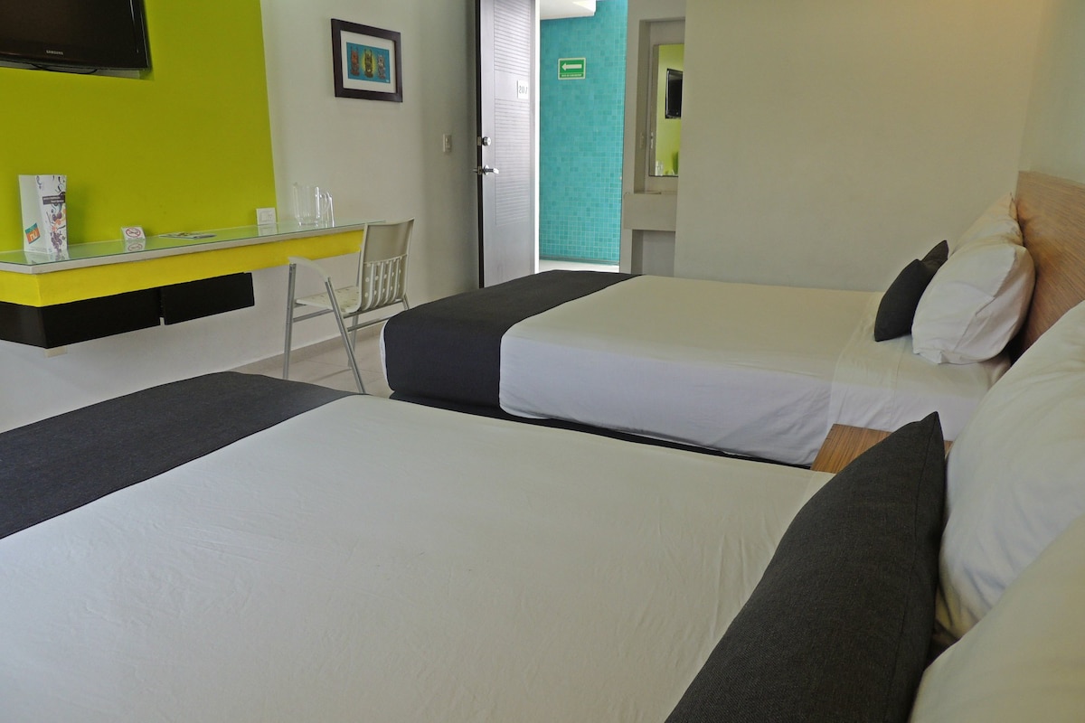 Amplias y cómodas habitaciones con aire acondicionado , smart TV, teléfono, baño independiente, restaurante, estacionamiento privado y techado, servicio diario de limpieza y recepción las 24 hrs. Ubicado a un costado de la central de autobuses ADO y frente al auditorio Benito Juárez. Reserva tu hospedaje y obten cupones de descuento para nuestra área de restaurante. Descuento de 10% en room service Descuento de 10% en desayunos paquete Descuento de 10% en consumo de cerveza.