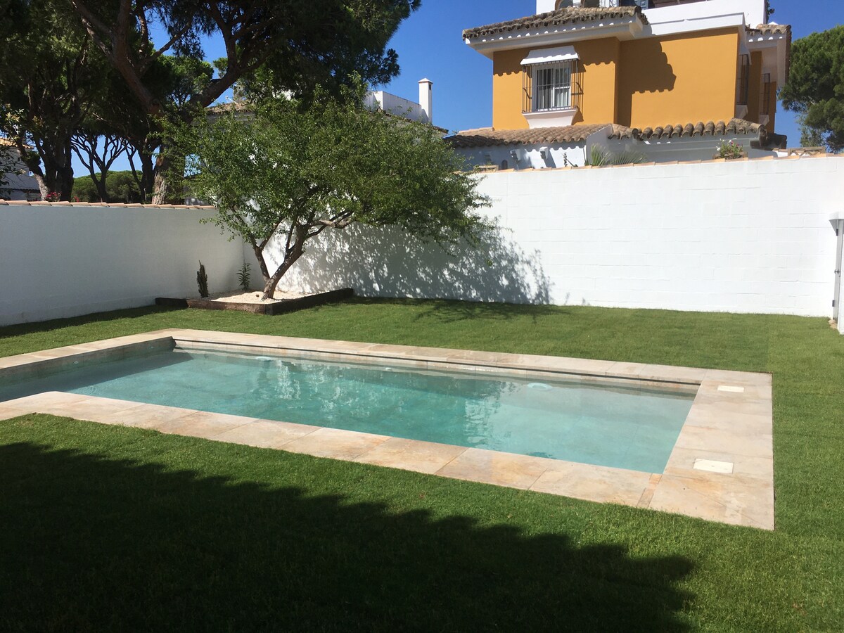 Excepcional villa individual en la playa de la Barrosa. Ubicación llena de luz, paz y tranquilidad y buenas sensaciones. Amplio jardín con piscina privada, barbacoa, 3 dormitorios, 2 baños, salón con chimenea, comedor, cocina, porche. Zona con todo tipo de servicios cercanos y fácil acceso, a 5 min.de la playa y 15 min del campo de golf de Sanctipetri, . Totalmente equipada para unas vacaciones perfectas. Si busca un lugar ideal esta preciosa casa, no le defraudará.