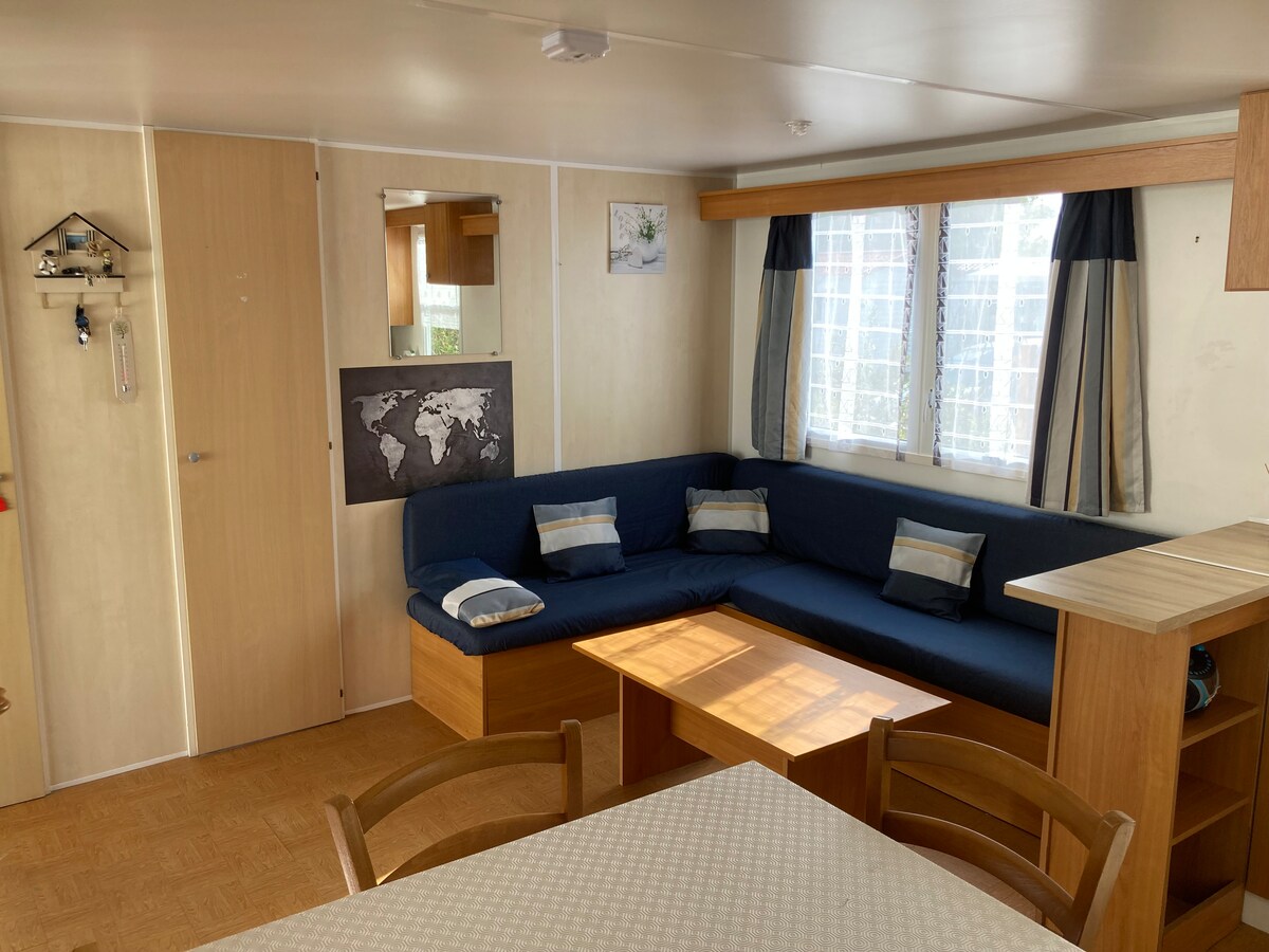 MobilHome de 4 a 6 personas en un camping de 3 estrellas con zona acuática, pistas deportivas, snack, restaurante, etc. La MobilHome tiene dos dormitorios y un sofá cama en la sala de estar (como suplemento). Una habitación con cama de matrimonio y la segunda con dos camas individuales. La sala de estar da a una gran terraza de madera cubierta, equipada con muebles de jardín con mesa y sillas + tumbona. Cuarto de baño en el interior de la vivienda con ducha + lavabo e inodoro separados.