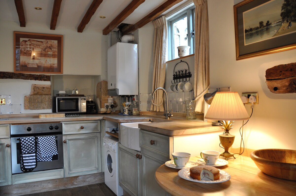 HUGE DISCOUNT! Escape to our cute 18c BLOCKLEY cottage where FATHER BROWN is filmed ! HAPPILY PRICED✅comfortable beamed sitting room + Smart SKY TV with ELEC log effect fire Well equipped NEW kitchen-private walled terrace-fab view -garden furniture🤩Upstairs King bed vaulted beamed ceiling/door to bathroom+loo WM/TD /MW great walks pubs BLOCKLEY CAFE/RESTAURANT/STORE 1 min via churchyard Wifi/ pubs 1-2 PETS£50 per pet street pkg free ***VINTAGE HUGE cast iron bath(tub)*** rain shower head
