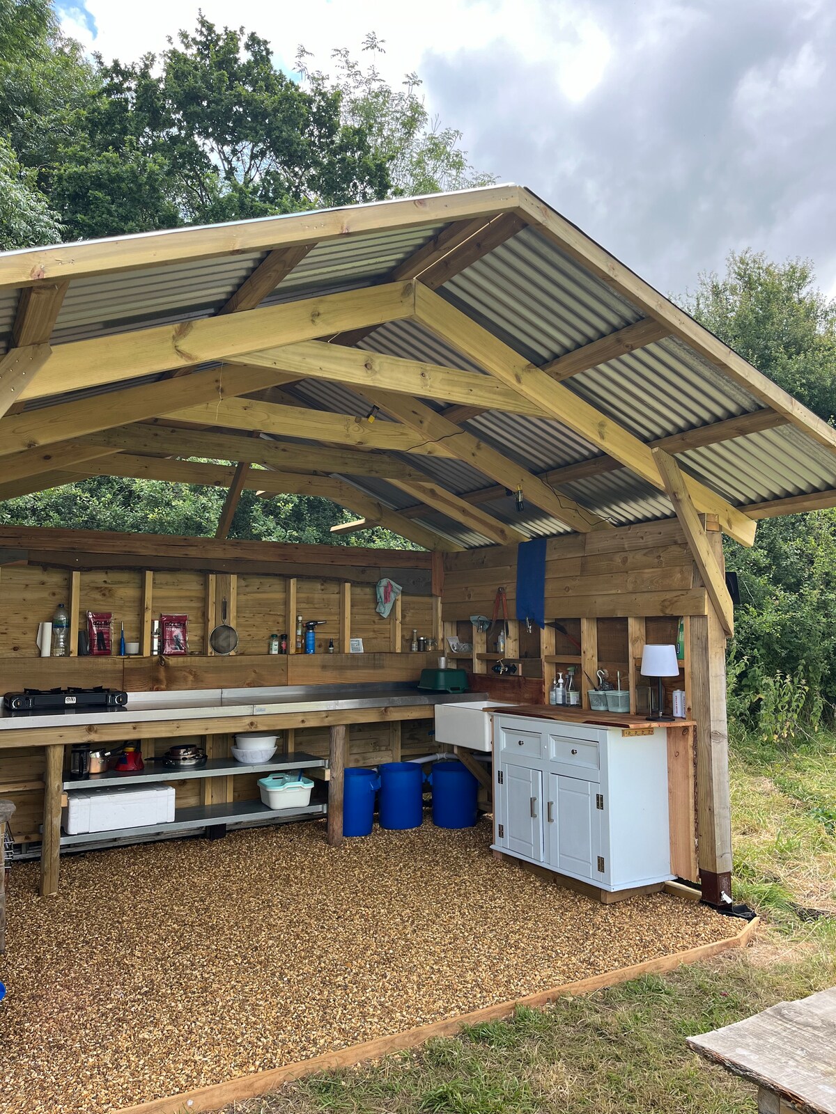 Encontrarás The Teasel Yurt escondida en el lateral de Selsley Common. La gran terraza da al valle de Severn y las colinas de Stroud, espectaculares en todo tipo de clima y un lugar estupendo para ver el atardecer. La yurta en sí tiene una capacidad máxima para 5 personas y cuenta con ropa de cama y toallas. Hay un quemador de leña para mantener la yurta acogedora cuando hace frío y la cocina al aire libre tiene un techo de lona, un quemador de gas, un fogón/barbacoa, un fregadero y una nevera. El baño tiene ducha caliente y retrete de compostaje.