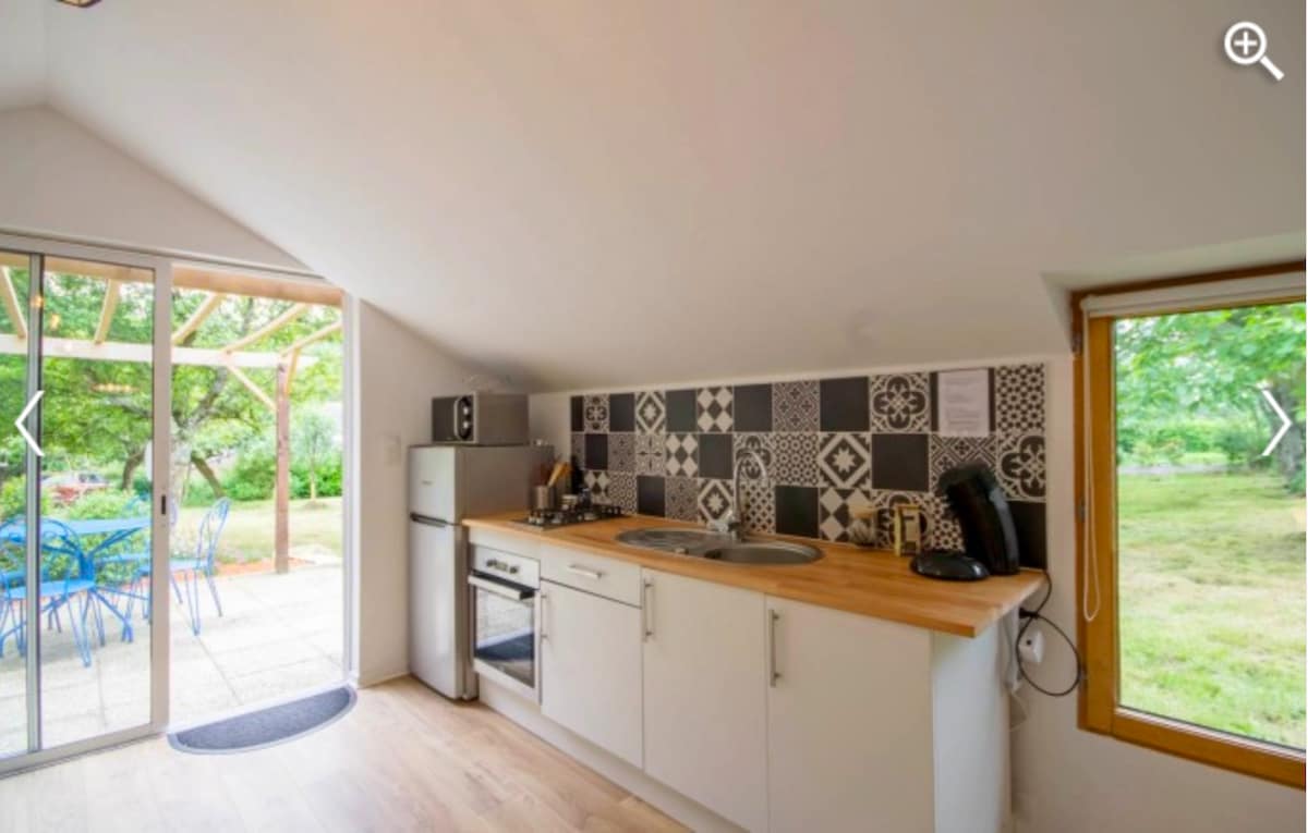 La casa es un gran y acogedor estudio de una sola planta, ofrece una sala de estar orientada al sur que da la bienvenida a la cocina totalmente equipada, un acogedor sofá cama con una mesa de café modular en la mesa de estar, luego un baño (ducha a ras de suelo) con un inodoro separado. Para almorzar al aire libre y disfrutar del sol, una bonita terraza protegida por el verde y orientada al sur con vistas al huerto. Jardín privado. Lugar de aparcamiento. La lavadora es común con los propietarios.
