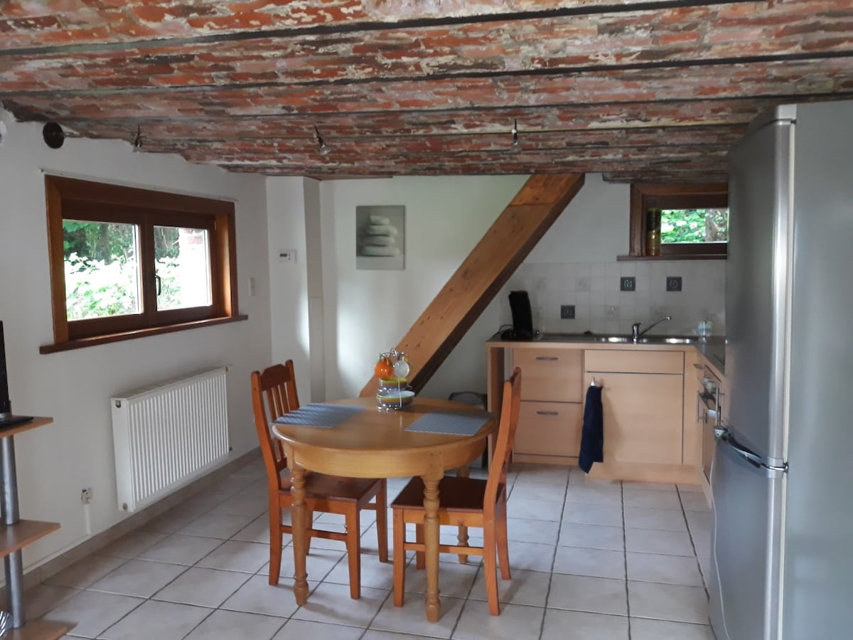 Bonita casita con carácter y encanto, retirada de la carretera, dedicada para 2 personas, con jardín (muebles de jardín y mesa) y barbacoa. Aparcamiento exterior gratuito. Posibilidad de entrar bicicletas. Planta baja: sala de estar con sala de estar y pellets de fuego, cocina equipada, nevera-congelador, placas de vidrio, microondas, campana extractora, horno, senseo. Arriba: dormitorio con una cama de 180x200, guardarropa, baño: inodoro, ducha y bañera. ¡Numerosas actividades turísticas!