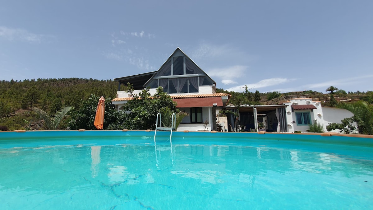 Ocupando una posición tranquila y separada, en una "Hacienda" cerrada de diez acres arrastrada por árboles frutales, bajo los pies de un antiguo volcán dormido, hoy en día un área natural protegida, a las afueras de la comunidad agrícola de "El Salto" en el sureste de Tenerife, se encuentra una casa de carácter, extremadamente espaciosa y bien equipada en todas partes.