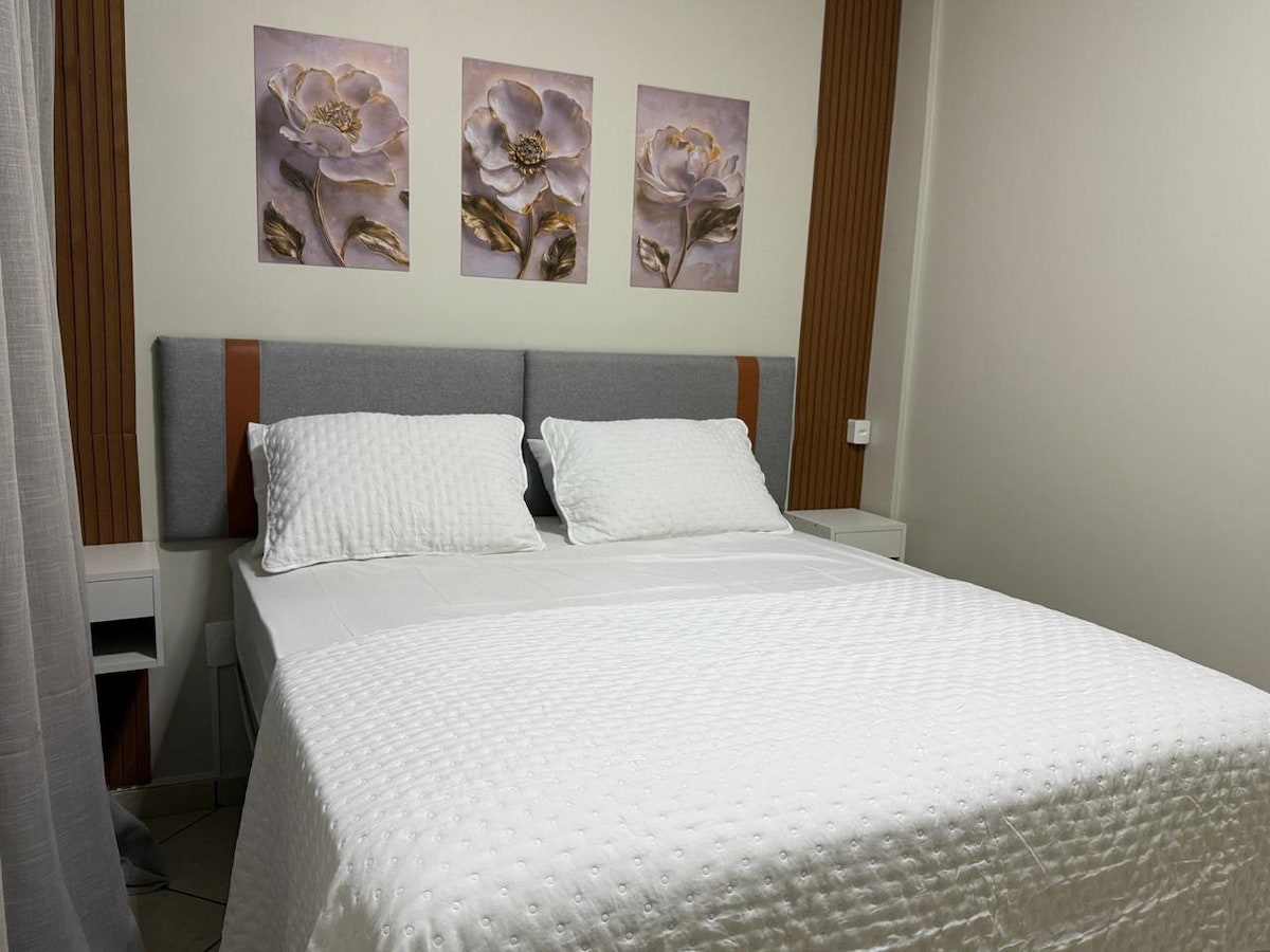 Nuestro apartamento es acogedor y limpio, nos alojamos dentro de un HOTEL a 300 metros del aeropuerto de Cuiabá/Várzea Grande (pero el apartamento es privado y nos pertenece a mí y a mi esposo, tiene llaves de seguridad). El apartamento también tiene un armario, una nevera en la suite, sábanas limpias, con jabón y papel higiénico. Estarás muy bien alojado, los apartamentos son personales y separados, ¡pero la cocina y la mesa de comedor afuera son COMPARTIDAS solo por mis huéspedes de Airbnb!