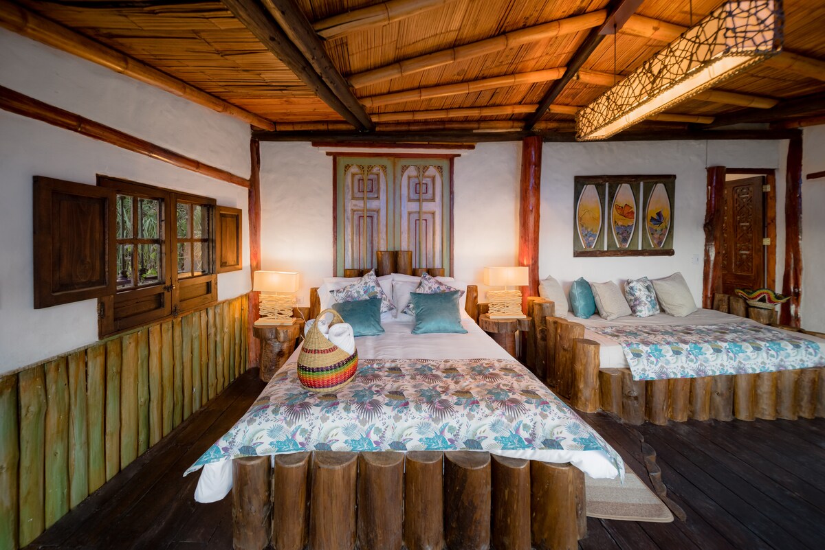 ¿Buscas un alojamiento único en Villa de Leyva? Nuestra espléndida suite Grand Master con baño privado combina comodidad y elegancia atemporal. Despiértate con impresionantes vistas del amanecer de las montañas en una acogedora habitación de primera categoría perfecta para parejas o grupos de familiares/amigos de hasta 5 + desayuno incluido. Relájate en el quiosco flotante junto al lago privado, disfruta de hermosos jardines, animales, cancha de baloncesto y más. Disponible bajo petición: almuerzo, barbacoa, cena junto a la chimenea, servicio de transporte, lavandería. NO SE PERMITEN FIESTAS.