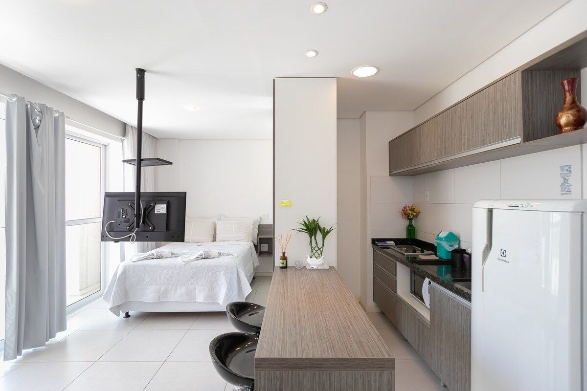 Estudio completo para (2) dos personas, con plaza de aparcamiento, situado a (1) una manzana de la PUC. Con aire acondicionado, wifi de gran velocidad, Smart TV, cama doble, cocina equipada, ropa de cama y baño, champú, jabón, escritorio, secador de pelo, plancha, junto a Shopping Estação, Carrefour y otros mercados, panaderías y restaurantes. Es súper cómodo con toda la seguridad, con llegada/salida autónoma.