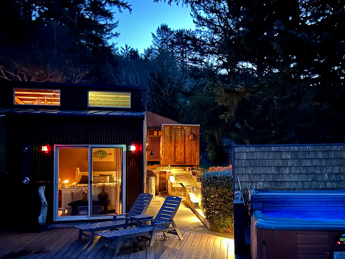 Wild Coast Lookout, situado en el hombro de una antigua pila marina, ofrece privacidad y una vista espectacular de la costa de Oregón. Con frecuencia se ven halcones y búhos en los árboles de la propiedad y, por la noche, mientras te sumerges en el jacuzzi, disfrutarás del sonido de las olas del mar y de un coro de ranas en el estuario de abajo. El mirador se encuentra a pocos minutos a pie de la playa de Turtle Rock y a poca distancia en coche de algunas de las costas de búsqueda de tesoros más espectaculares del noroeste del Pacífico.